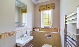 Fully tiled and in good order throughout, the en-suite serving bedroom 3 offers a shower over bath with glass screen, a vanity sink, WC and heated towel rail.