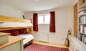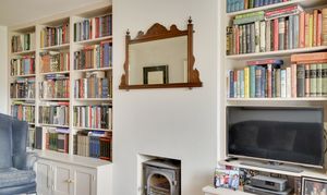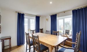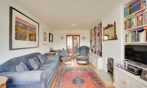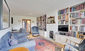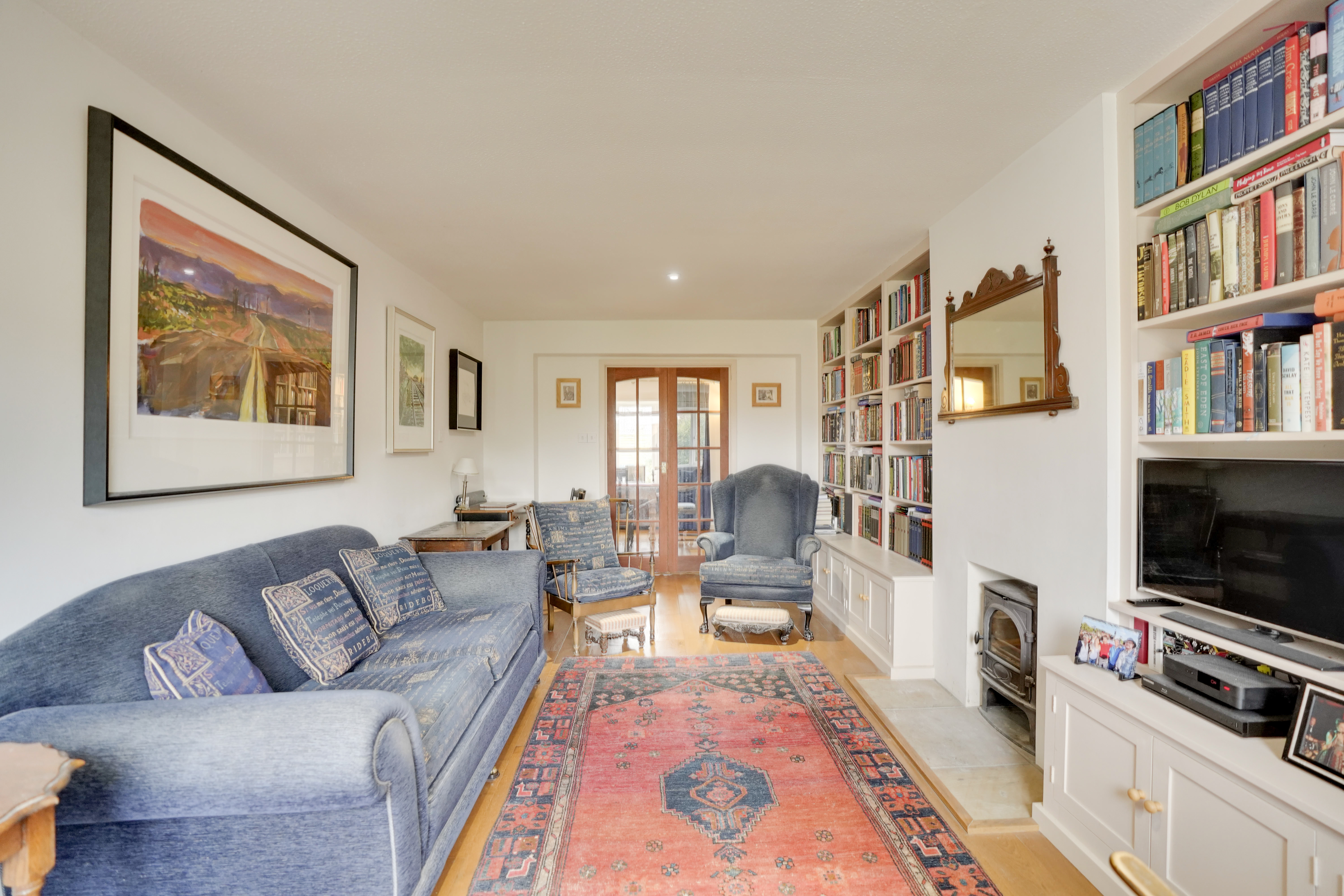 The sitting room is a charming, light-filled space featuring a multi-fuel burner and French doors opening into the dining room. The dining room is a versatile room ideal for family living, with built-in shelving and further French doors opening onto the rear garden, allowing plenty of natural light.