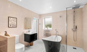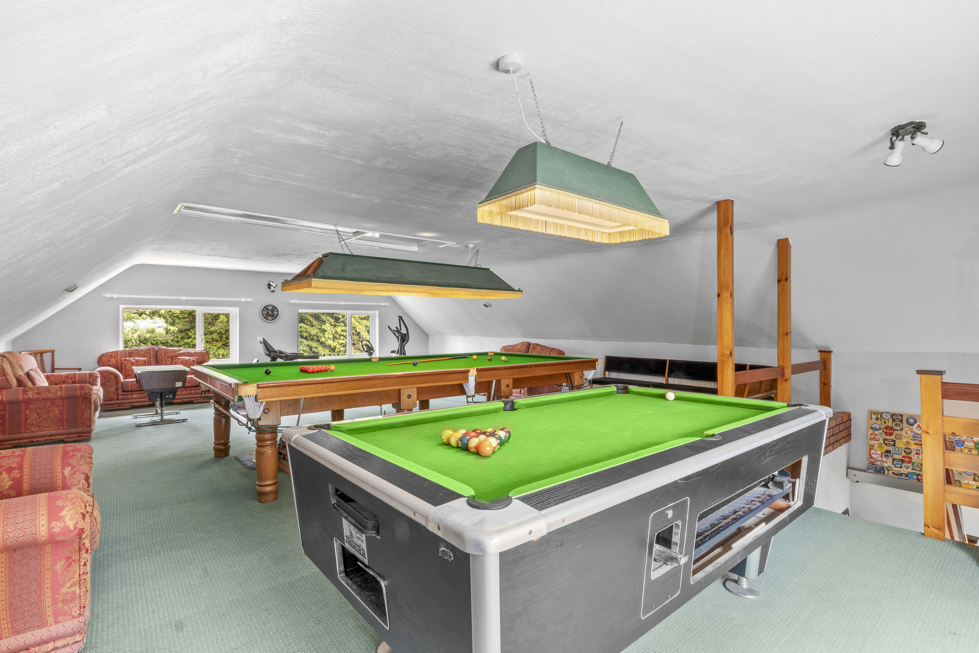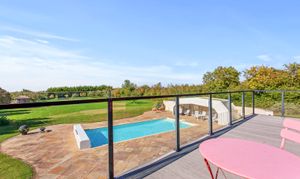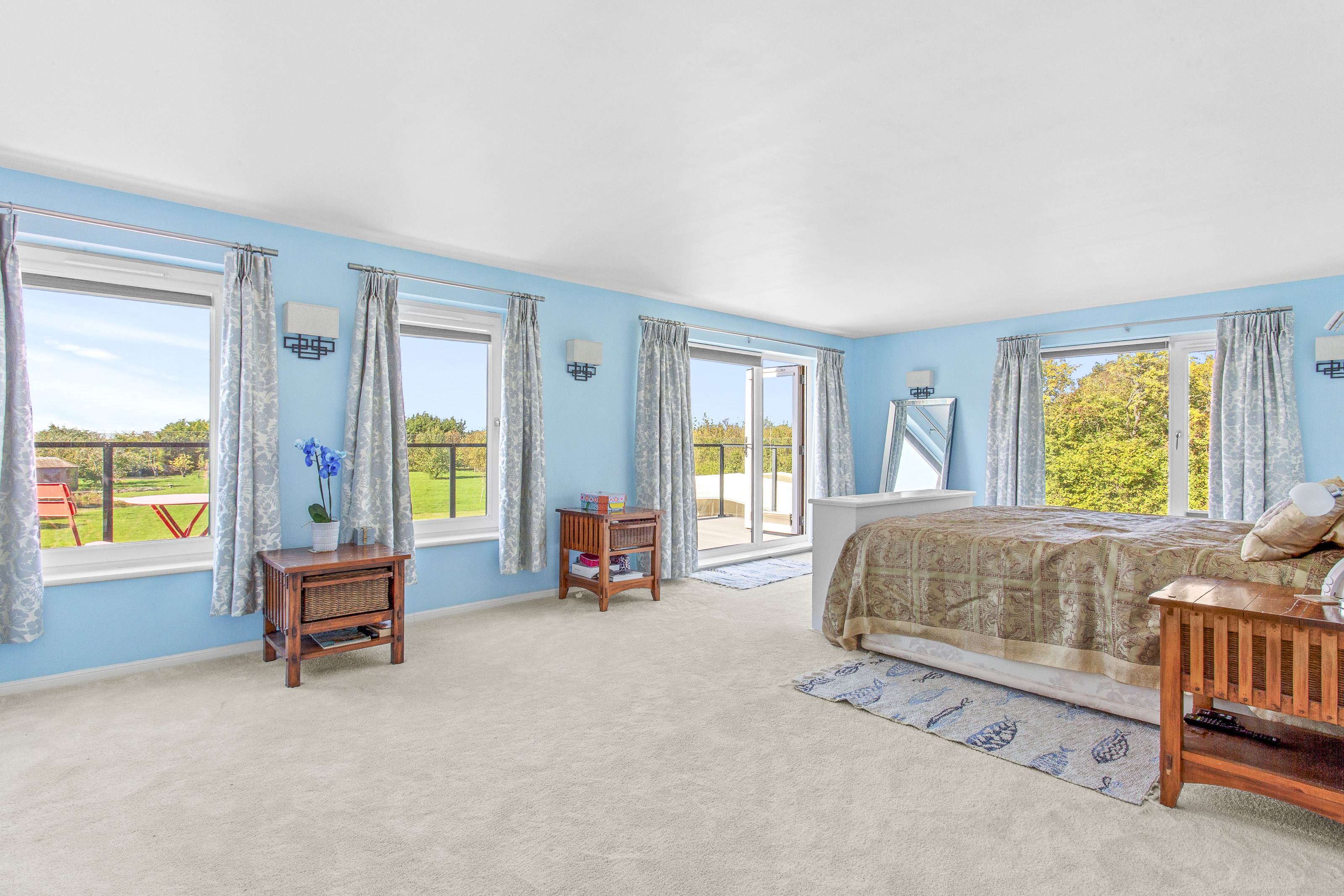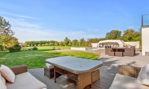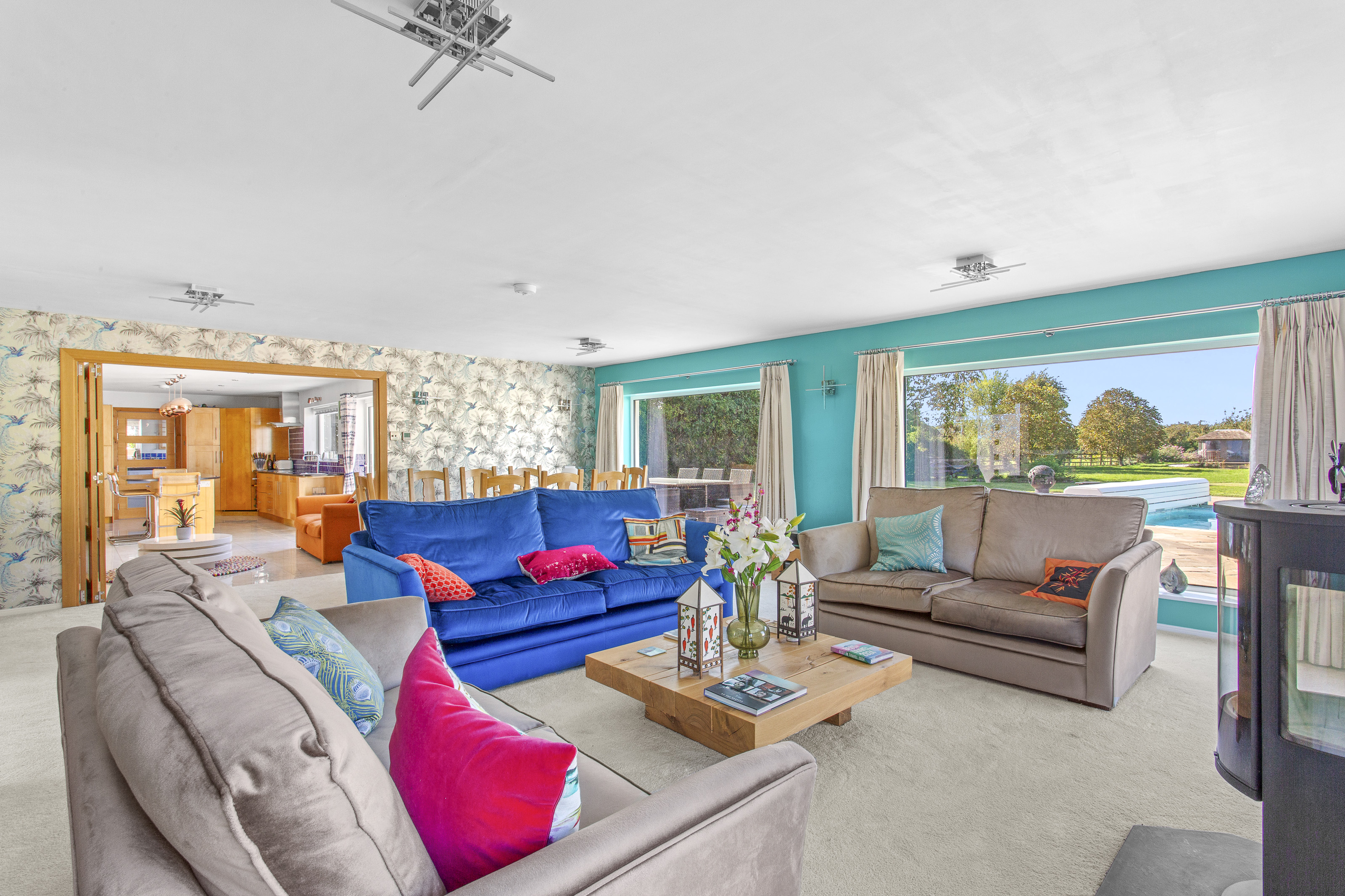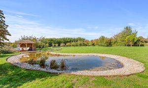 The property is approached via electric gates leading to a generous circular driveway provides ample parking for numerous cars; the driveway continues on round to the triple garage. Directly behind the house there is a large area of decking leading to an extensive paved terrace up to and around the pool, perfect for outdoor entertaining. The gardens enjoy a lovely south westerly aspect with a wide expanse of lawn interspersed with mature bushes, shrubs, trees and hedging on the boundaries, providing plenty of privacy. A feature of the large garden is the large pond and adjacent summerhouse, proving a lovely tranquil setting. There is also a greenhouse and vegetable plots.
