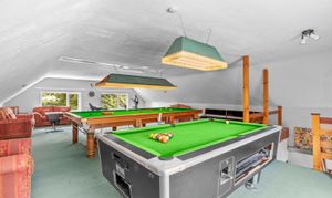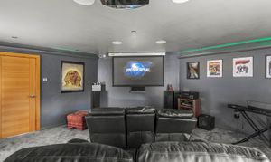 The full height reception hall is a real masterpiece with a beautiful, curved staircase and landings which are quite breathtaking. The kitchen/breakfast room is the central hub with bi-fold doors out to the garden and a large family size adjoining utility room. There are doors connecting with the separate formal dining room and the dual aspect sitting room overlooking the garden. There is a dedicated cinema room, a study and a staircase leading up to a large games room.