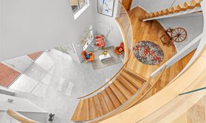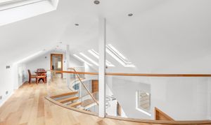 The stunning curved landing is the centre pieces with its amazing curved glass; leading all the bedrooms and up the next floor. The main bedroom suite has doors out to a sun balcony overlooking the garden, plus ‘his and hers’ ensuite bathrooms. There are three further bedrooms on this floor, all of which are ensuite. The second floor has a spectacular open plan study or family area, plus a further large bedroom suite.