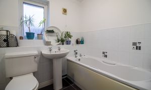 The bathroom is situated at the front of the property and comprises a white modern bathroom suite with partially tiled walls.