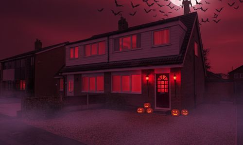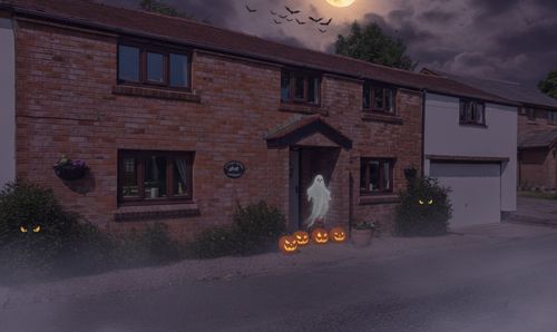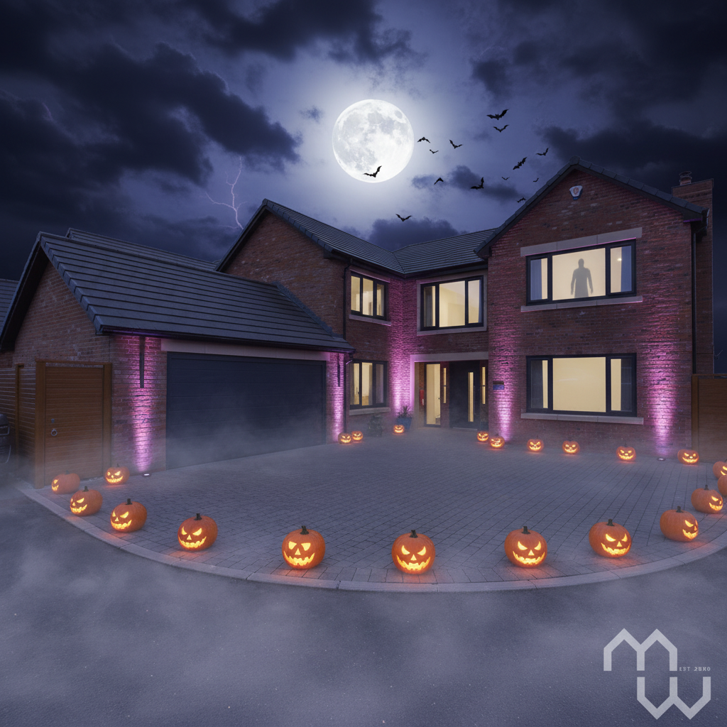 To the front, a spacious driveway leads to a double garage, featuring an electric charging point on the right-hand side.