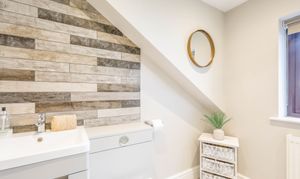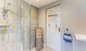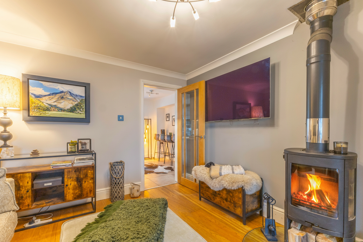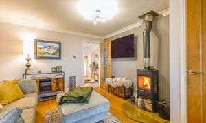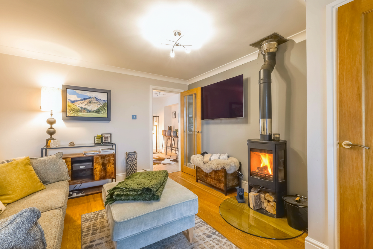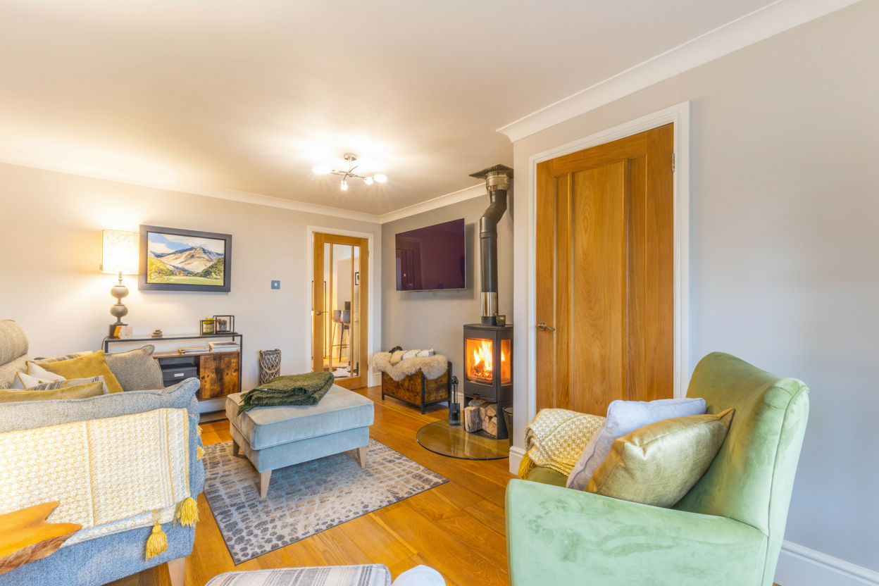 The ground floor offers a well designed and sociable layout, centred around a stunning fitted kitchen complete with breakfast bar and dedicated dining space. Patio doors open onto the rear garden, allowing natural light to flow through and creating an ideal setting for entertaining and everyday living. The separate lounge provides a cosy retreat, enhanced by a log burning stove. A useful understairs cupboard offers potential as a pantry, and a ground floor WC adds further practicality. A porch area and external storage cupboard provide additional convenience.