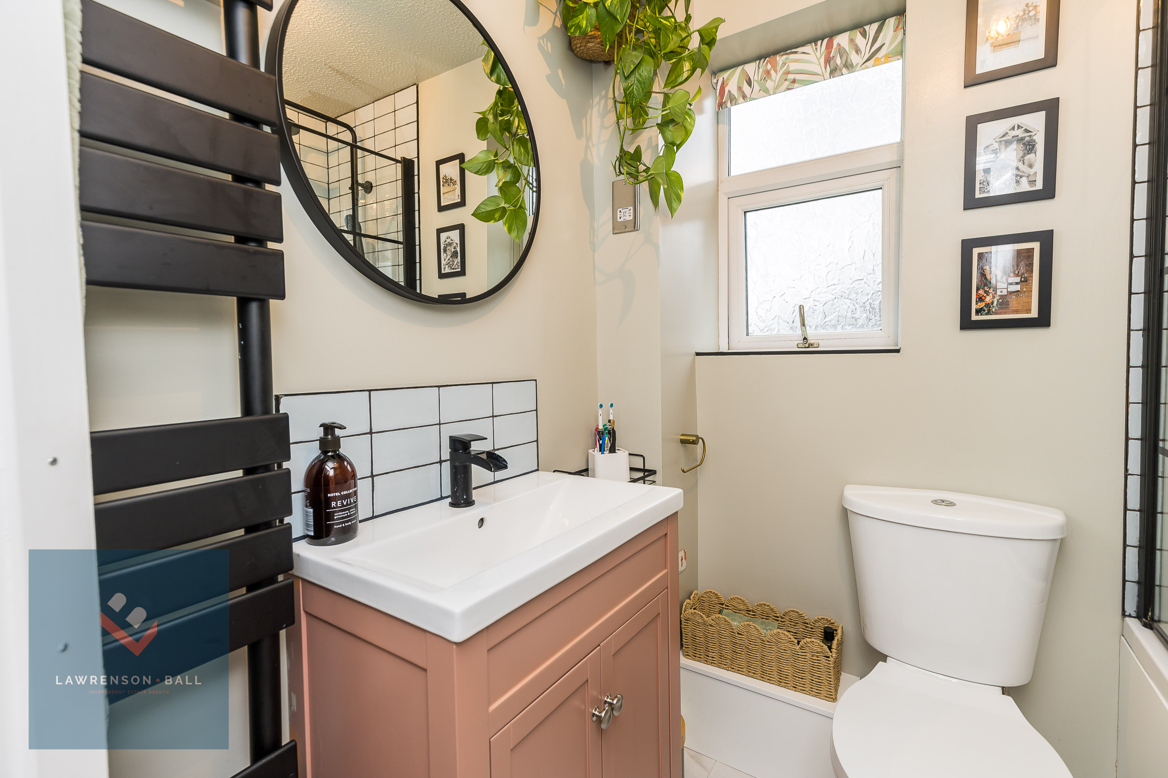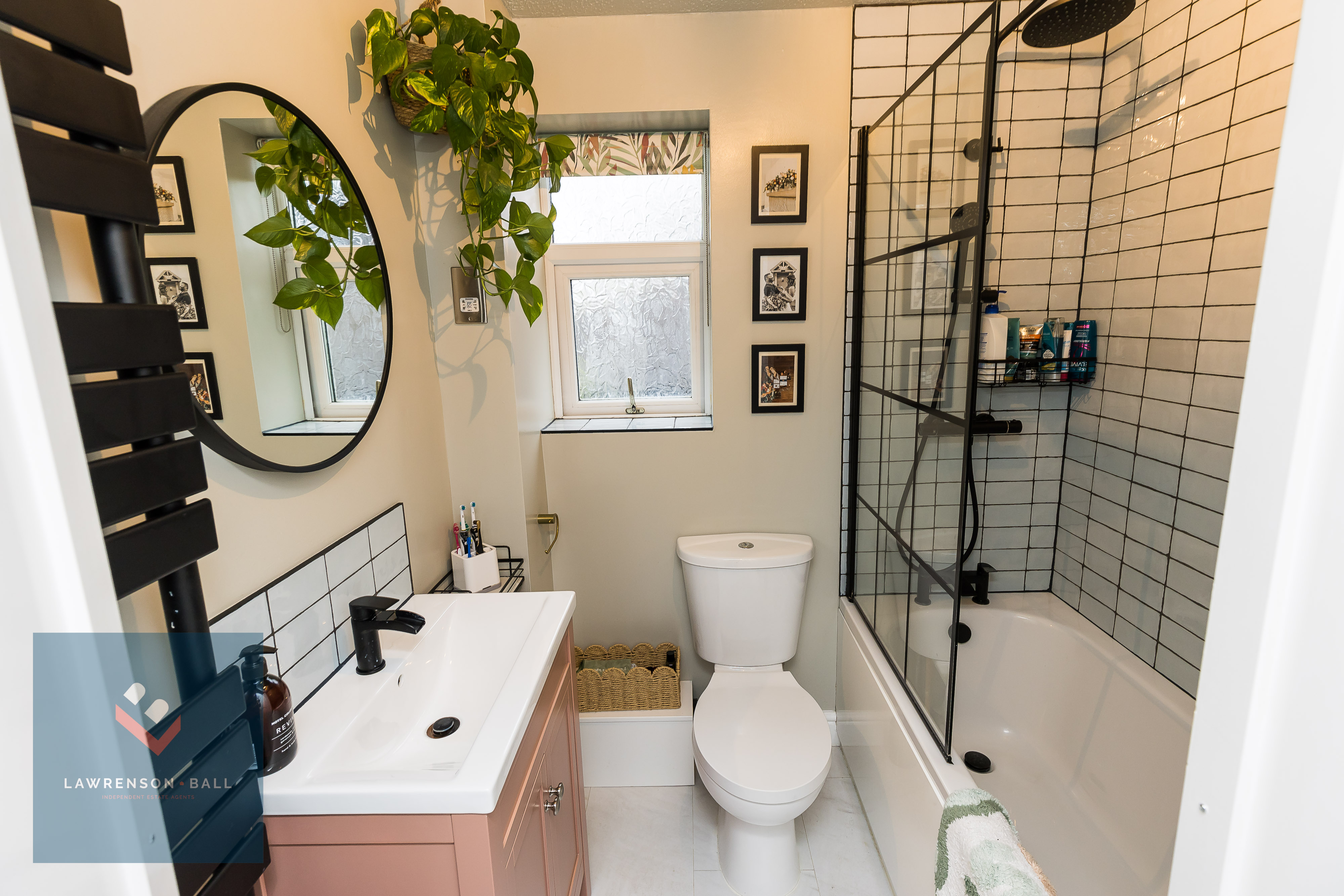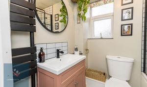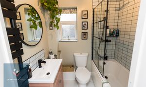 Beautifully presented family bathroom. Fitted with a modern three piece suite of bath with overhead shower. Stylish glass pivot shower screen. Painted vanity unit with black mixer tap. W/C. Black ladder towel radiator.