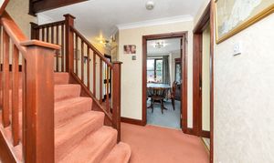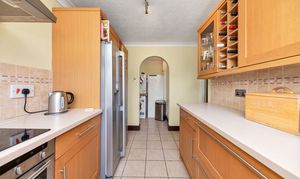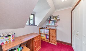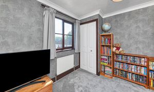 This spacious property enjoys great kerb appeal, with an attractive frontage of cream render and exposed brick detailing, a front lawn garden with shrubs and hedgerows, and space for potted plants. Upon stepping inside, the entrance hallway is welcoming, with integrated storage, carpets, stairs to the first floor, pendant lighting and doors through to the downstairs living space, including a study and a cloakroom WC.