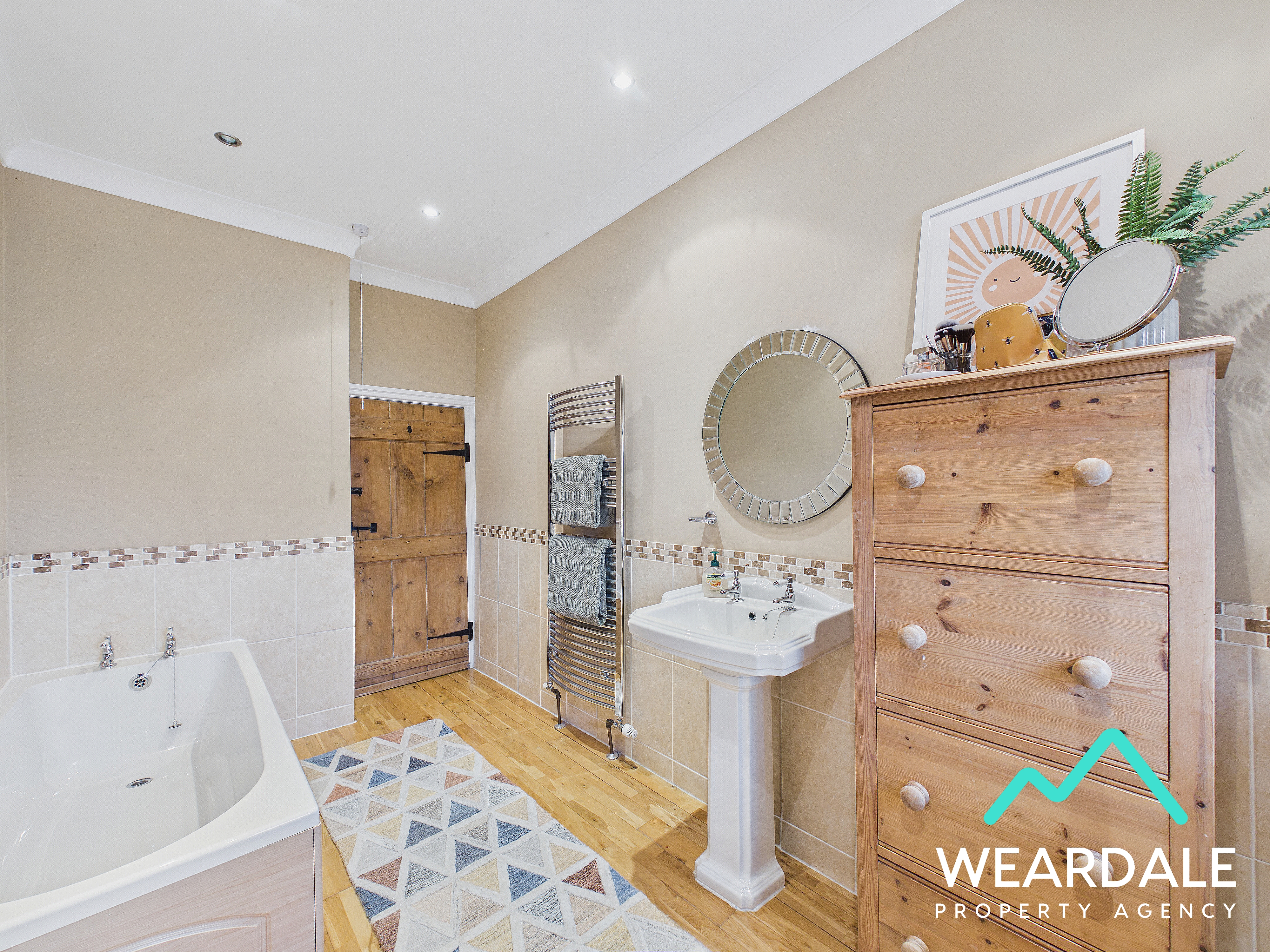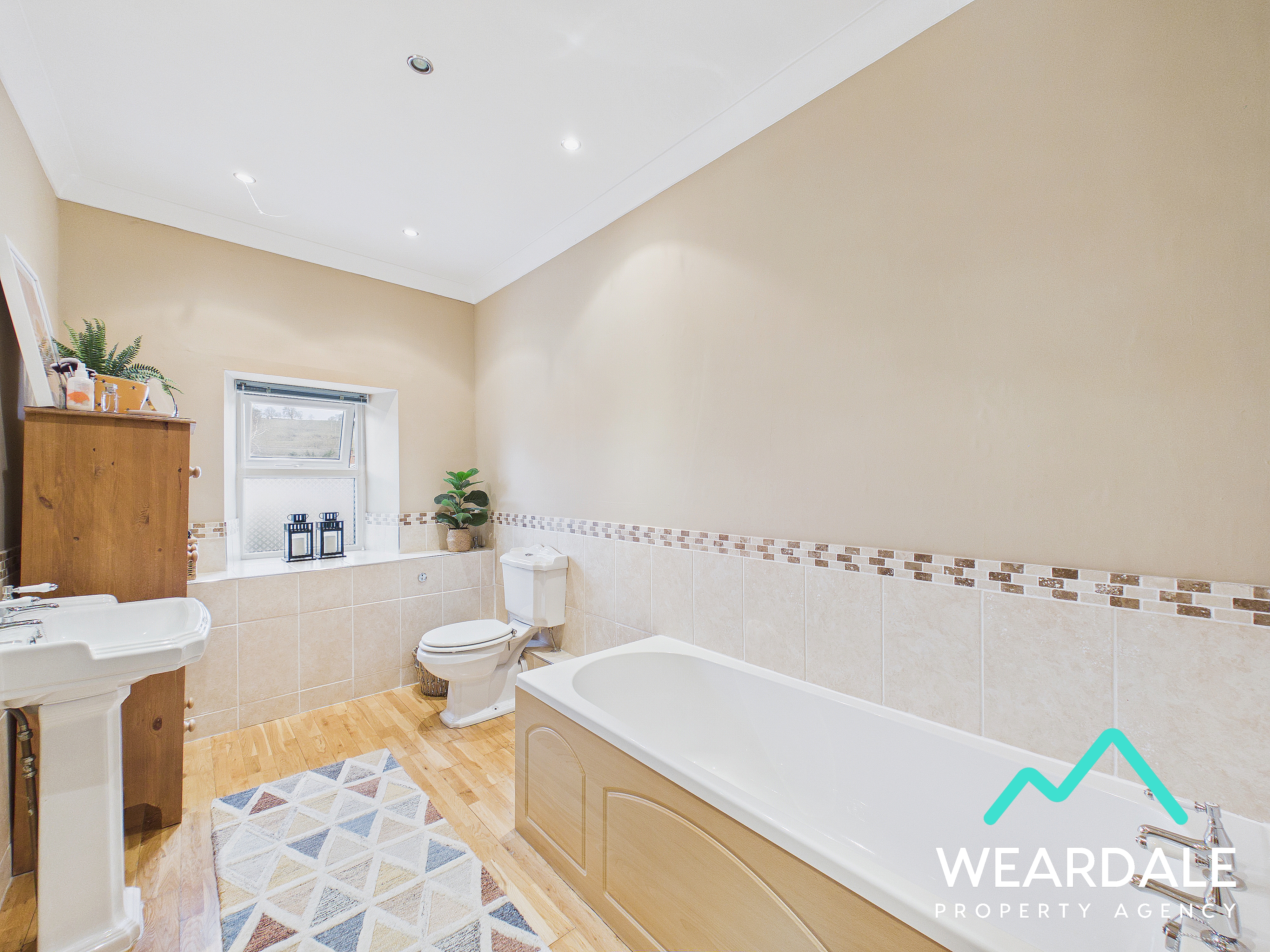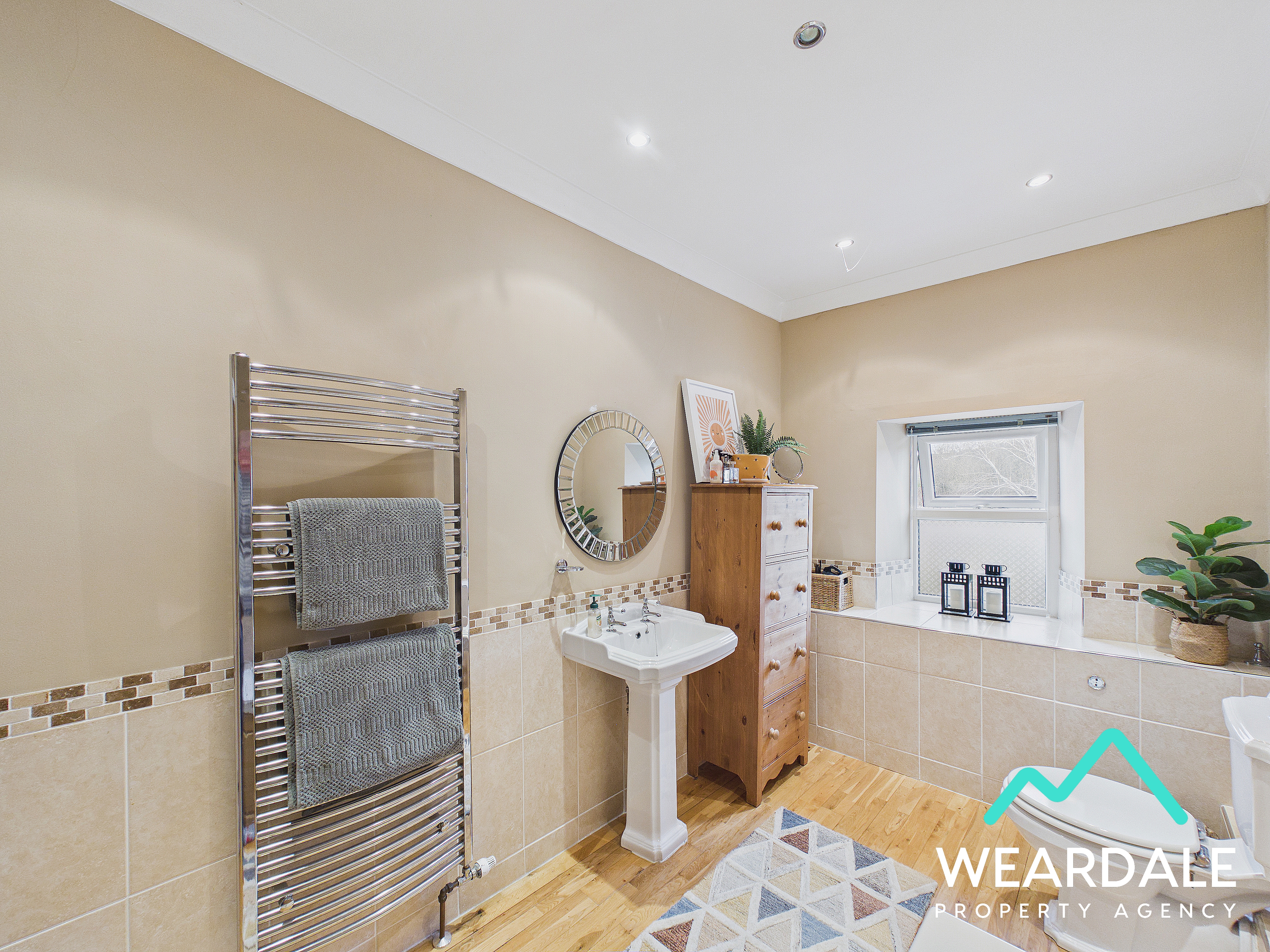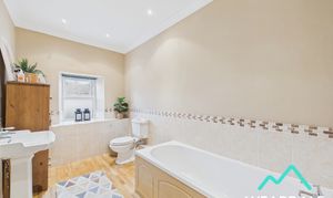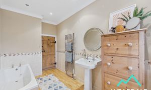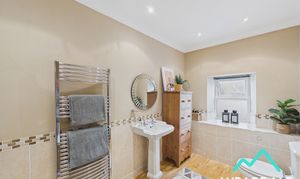 - Accessed from the second stage of the landing - Large family bathroom - Double-glazed uPVC window with frosted pane and deep tiled sill to the Southern aspect - Wooden flooring - Neutrally decorated - Half-tiled walls - Panel bath - WC - Hand-wash basin - Ceiling spotlights - Vertical heated towel rail - Ample space for free-standing storage furniture