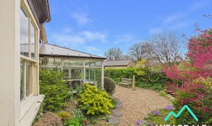 - A wrought iron gate opens from the access track that runs along the front of the property, to a flagstone pathway that leads to the front door of the house - Small front garden laid to flagstones, with borders planted with flowers and mature shrubs