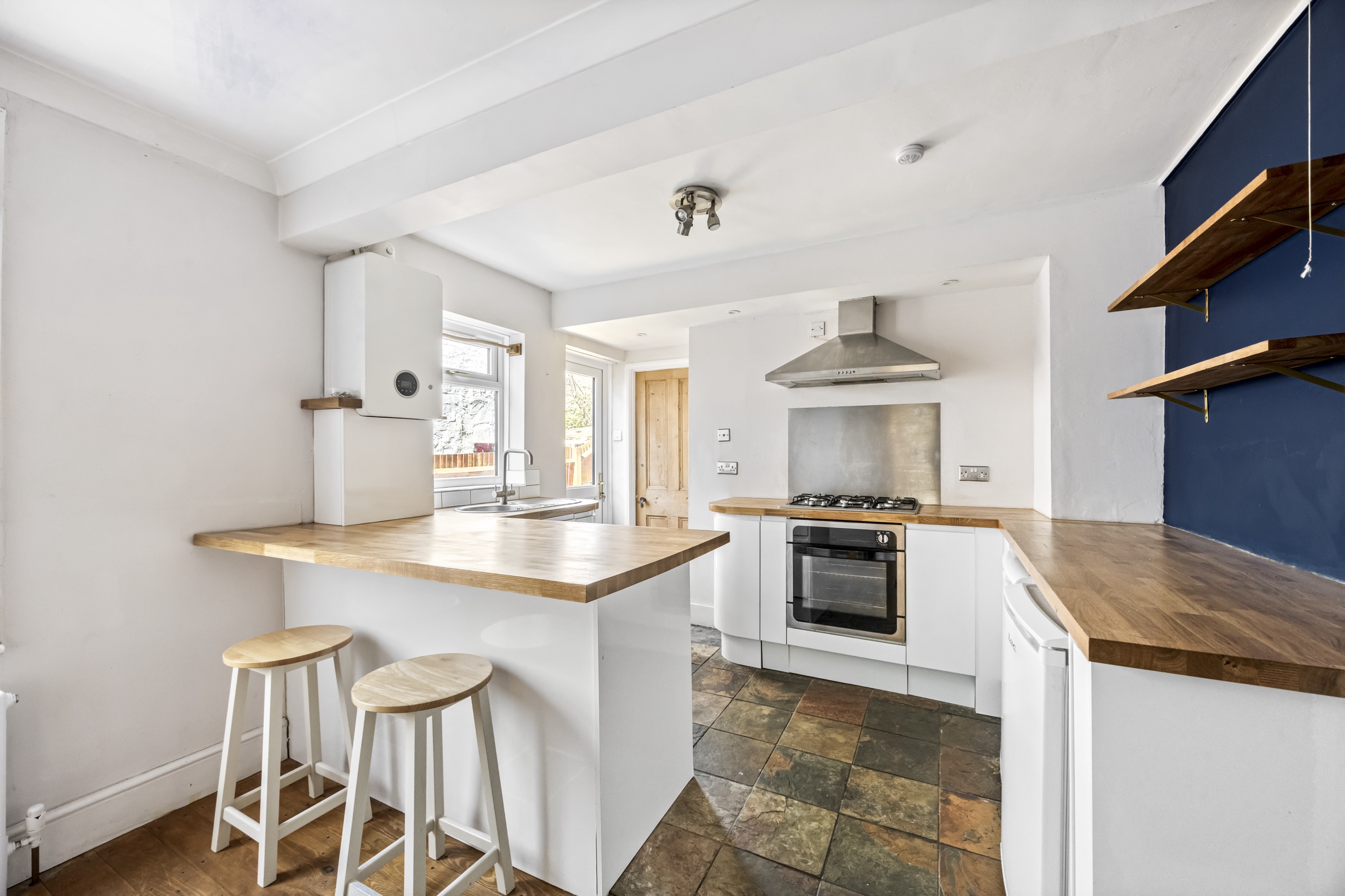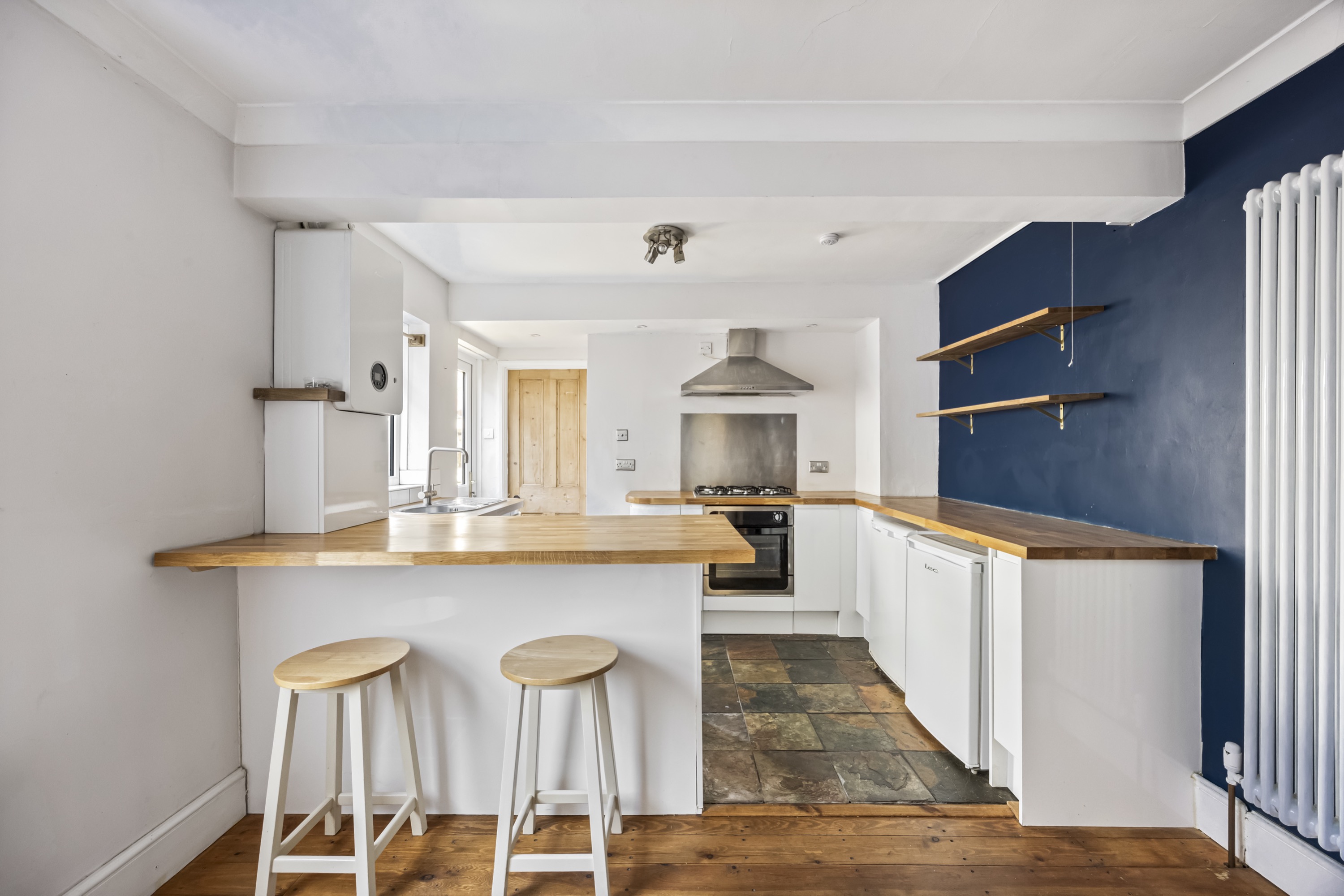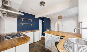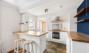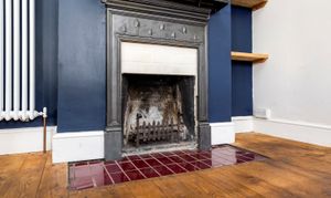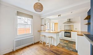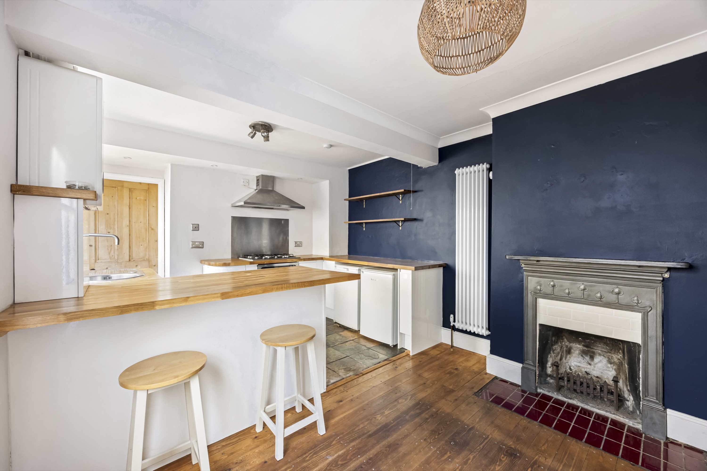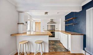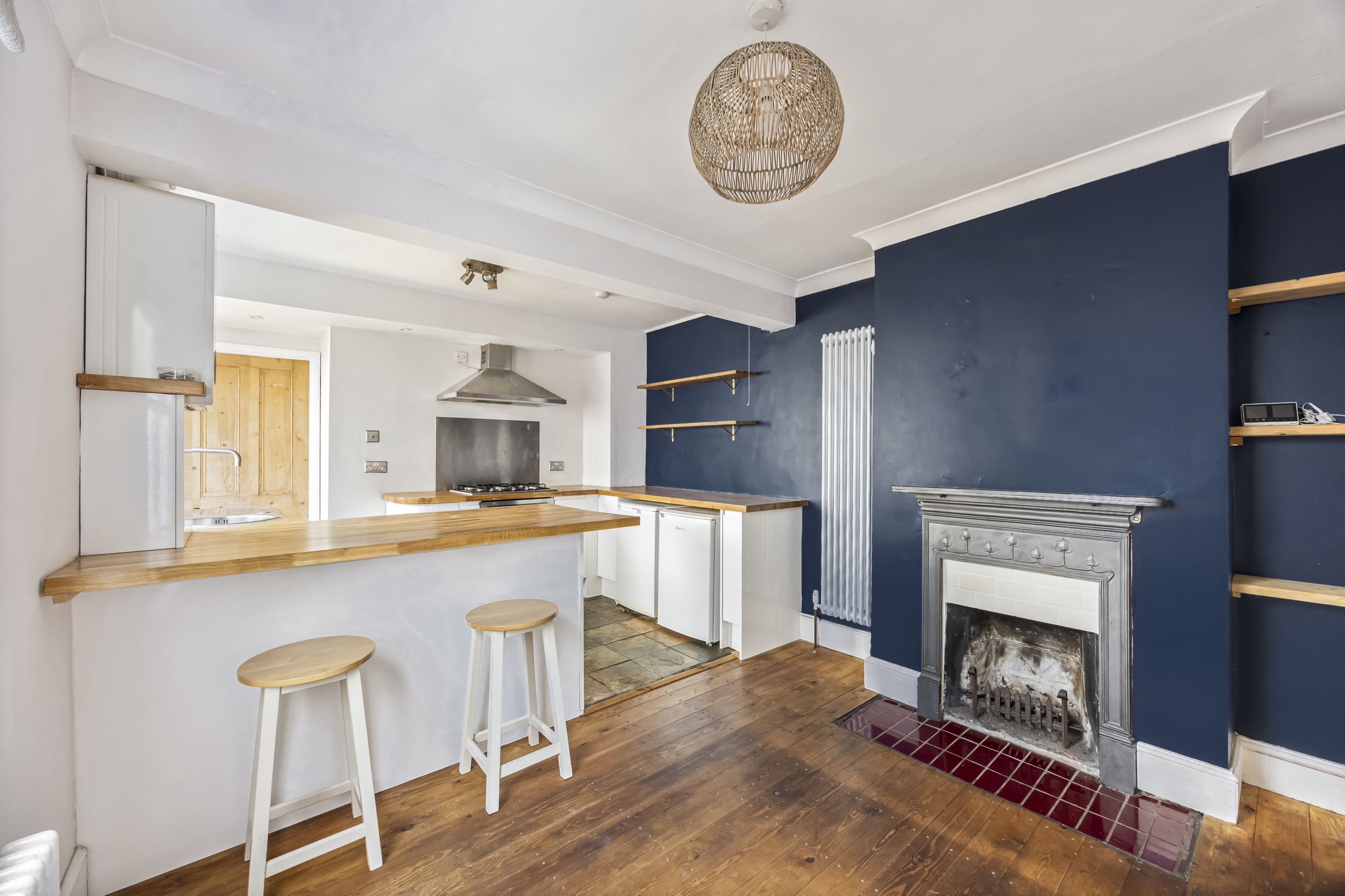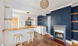 The property features a spacious open plan kitchen and living room, showcasing an ornate cast-iron fireplace that creates a charming focal point. The contemporary kitchen is well-equipped with sleek handless units, a breakfast bar for informal dining, and ample storage, catering to both every-day living and entertaining.