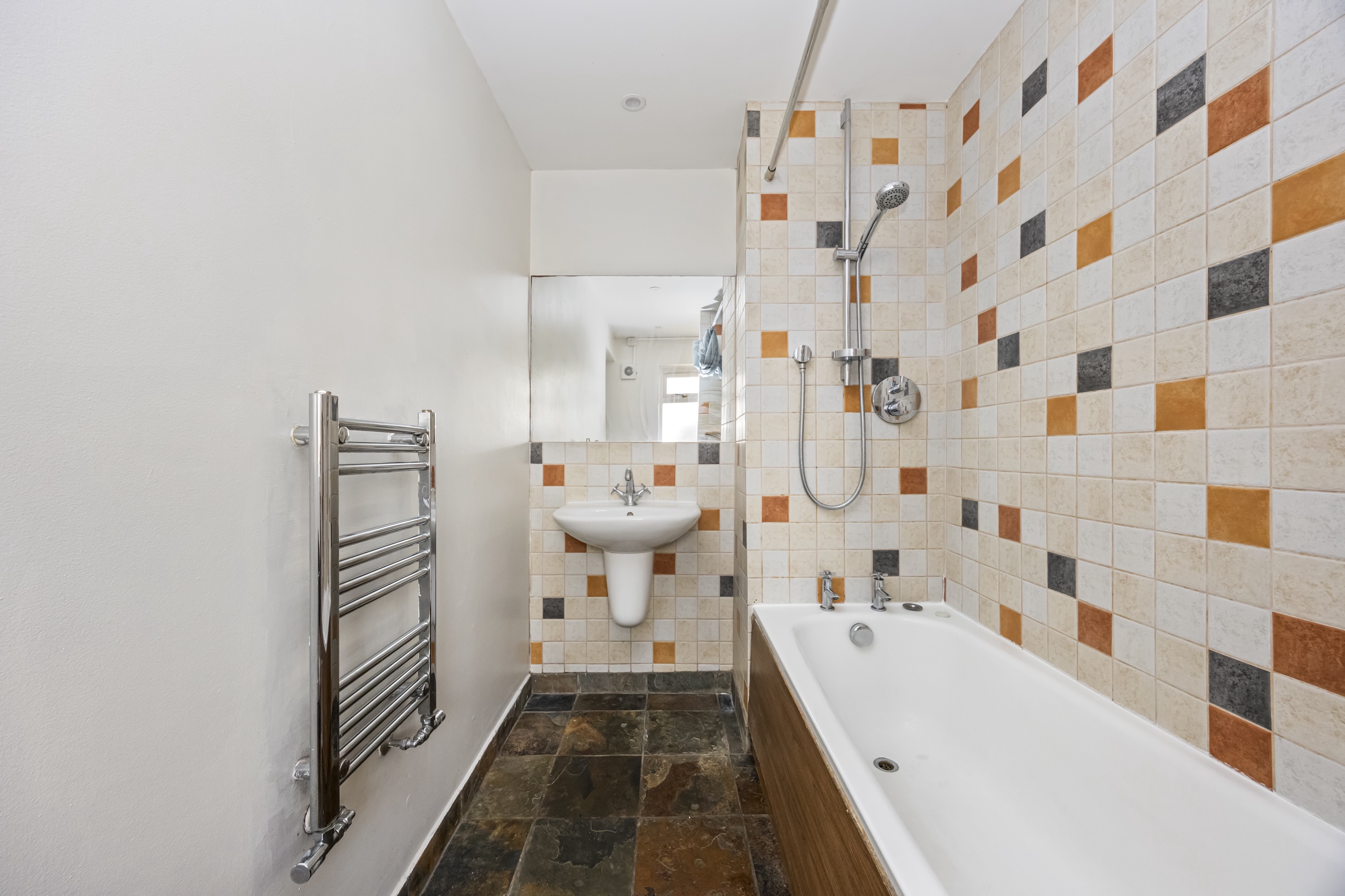 Both bedrooms are generous doubles, offering comfortable accommodation with space for wardrobes and additional furnishings. The partially-tiled bathroom is fitted with a bath and overhead shower, providing versatility for both quick morning routines and relaxing evenings.