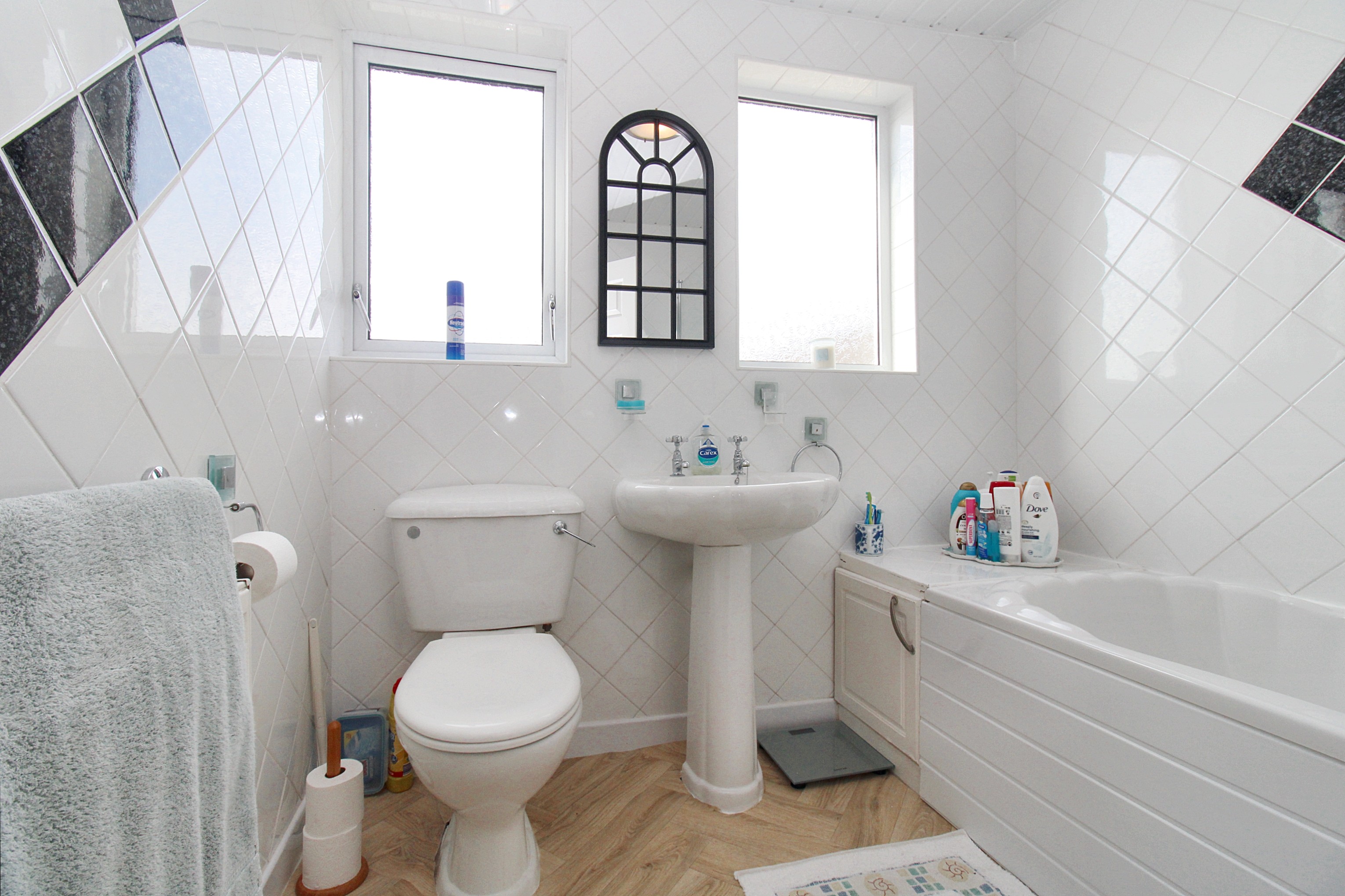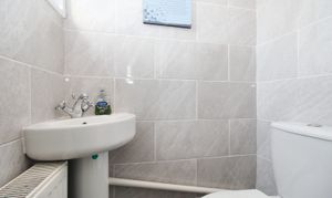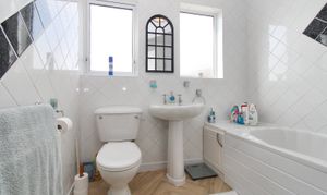 With vinyl flooring, wash hand pedestal basin, WC, bath cubicle, shower attachment, double glazed windows and radiator.