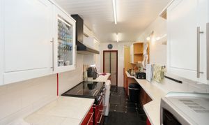 With tiled flooring, extractor fan, sink/drainer, plumbing for washer/dryer, range cooker, laminate work surfaces , open arch leading to the sitting room and door leading to the rear porch.