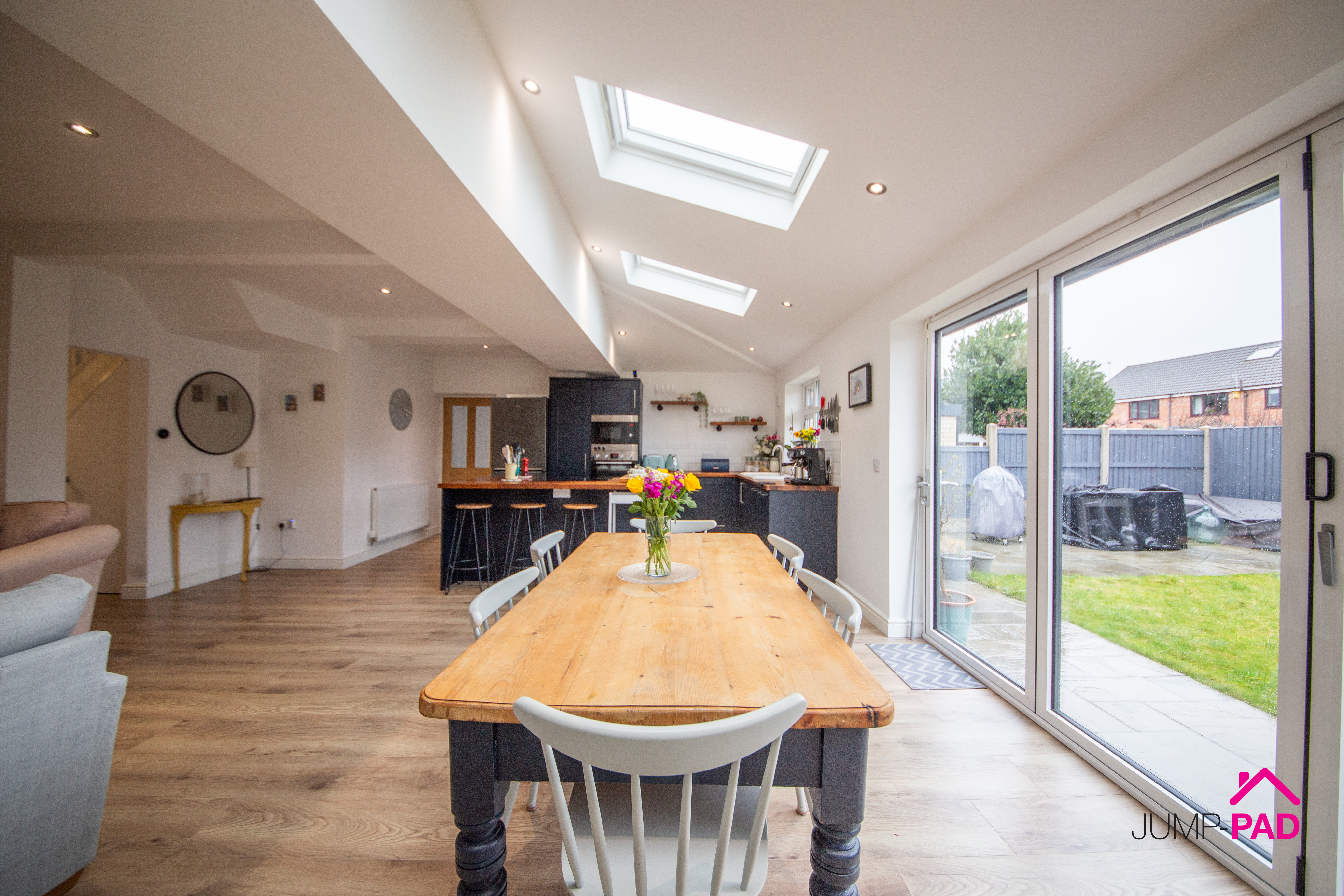 A stunning open-plan kitchen/dining/family room boasting a navy shaker-style kitchen with wooden worktops and a centre island. Integrated appliances include a double oven, a microwave, a dishwasher, and an induction hob. The dining area features Velux windows and bi-folding doors, flooding the space with natural light, complemented by recessed lighting and wooden flooring throughout. The cosy family area includes a feature fireplace and neutral decor.