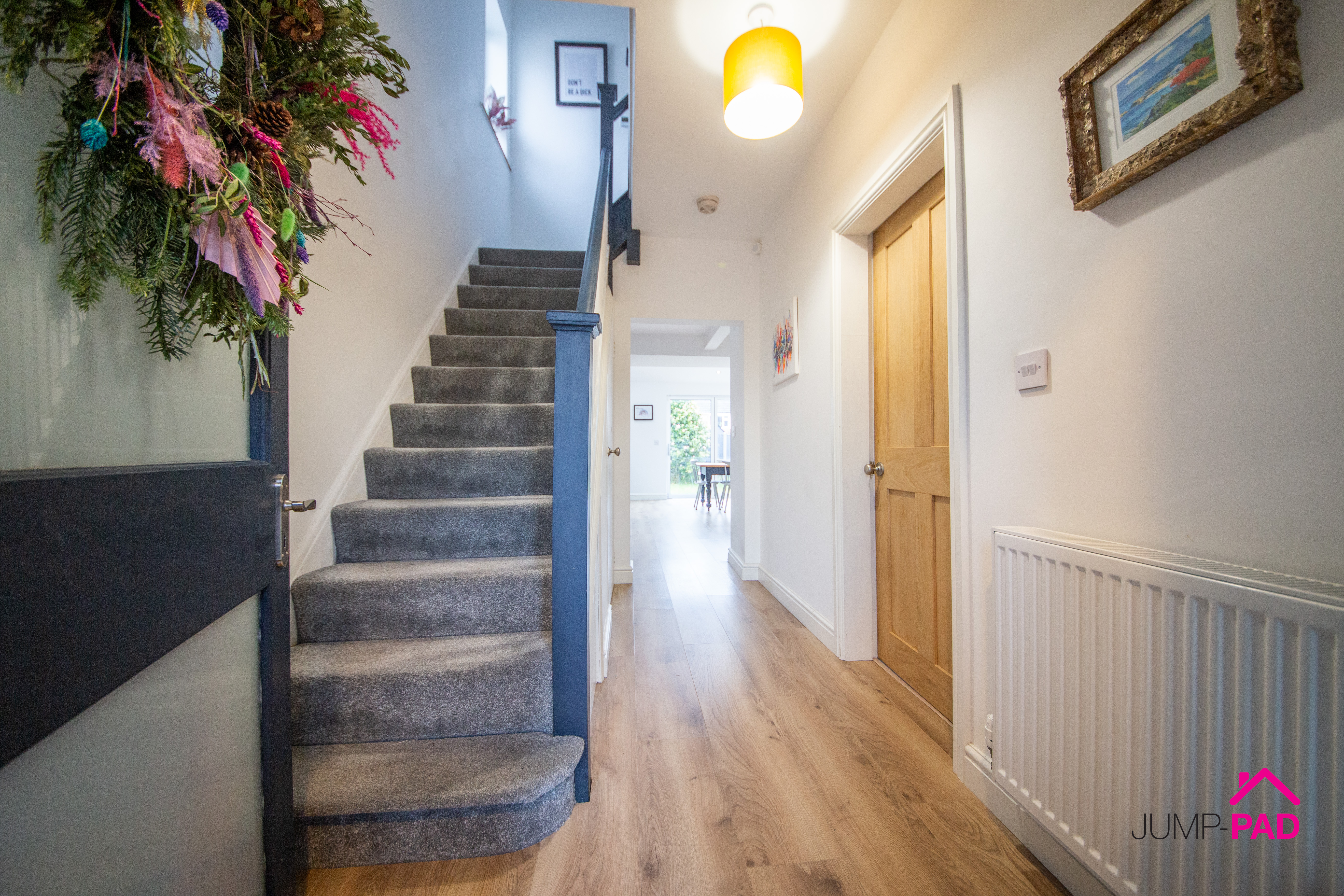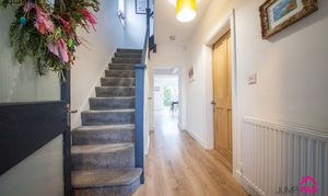 The inviting hallway features wooden flooring, useful understairs storage, a stripped pine door into the living room, leading through to the fabulous kitchen/dining/family room.