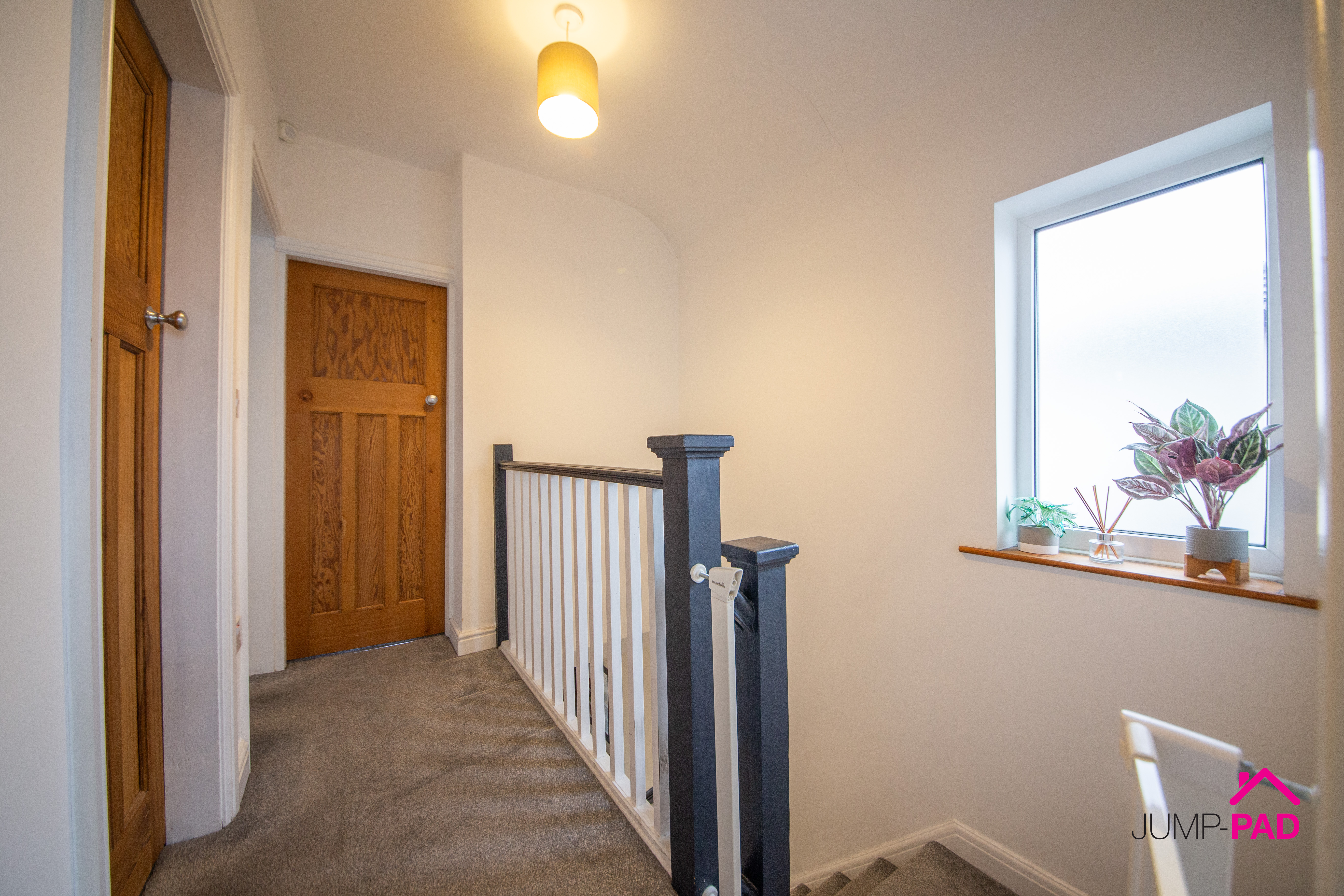 The landing features original stripped pine doors, a window to the side elevation, a navy handrail, and a grey carpet. Access to the fully boarded loft