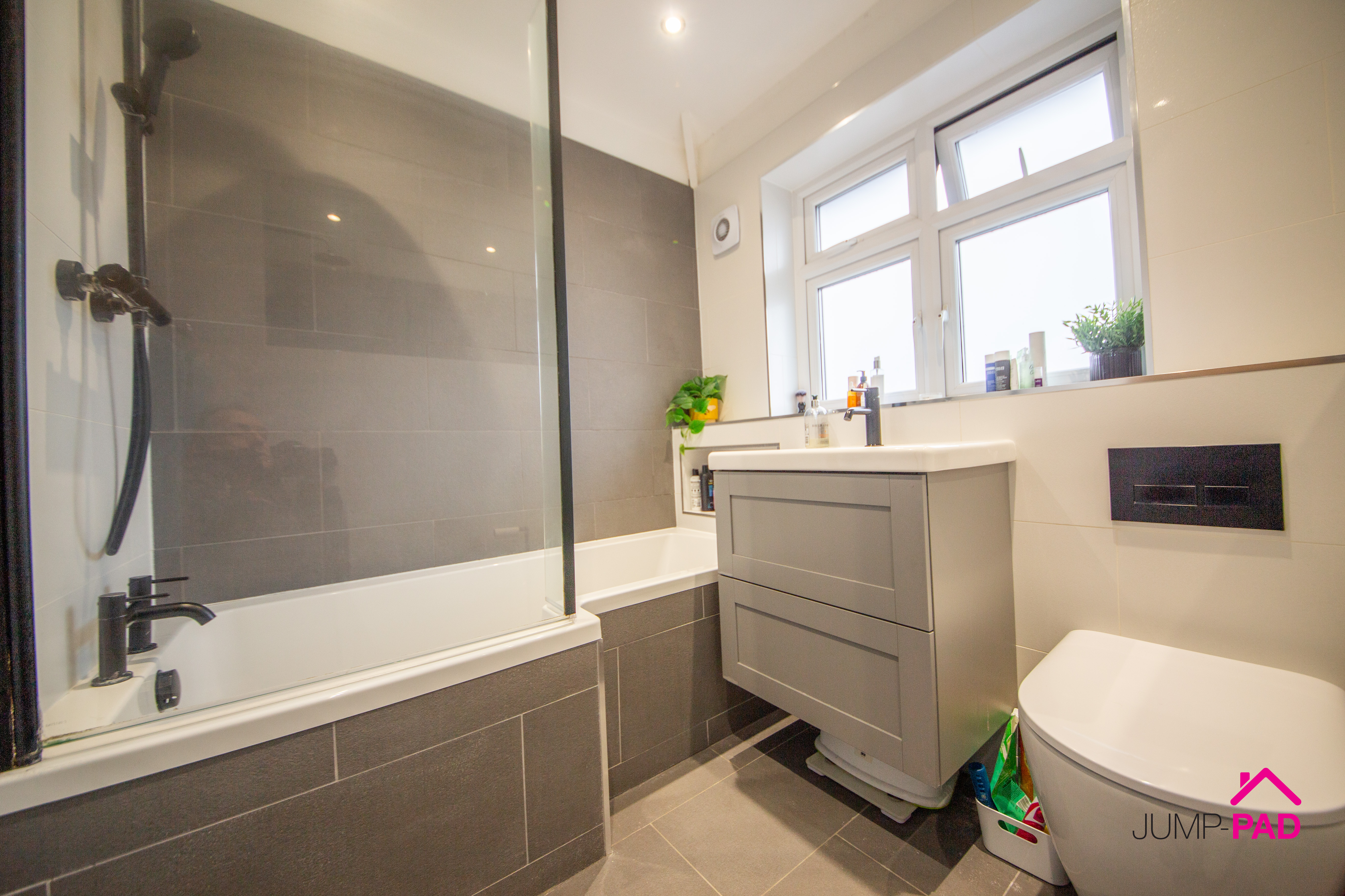 The family bathroom includes a white suite with a P-shaped bath, a glass shower screen, and anthracite taps, a floating vanity sink unit, an enclosed cistern WC, and feature grey wall and floor tiles. An added benefit is underfloor heating