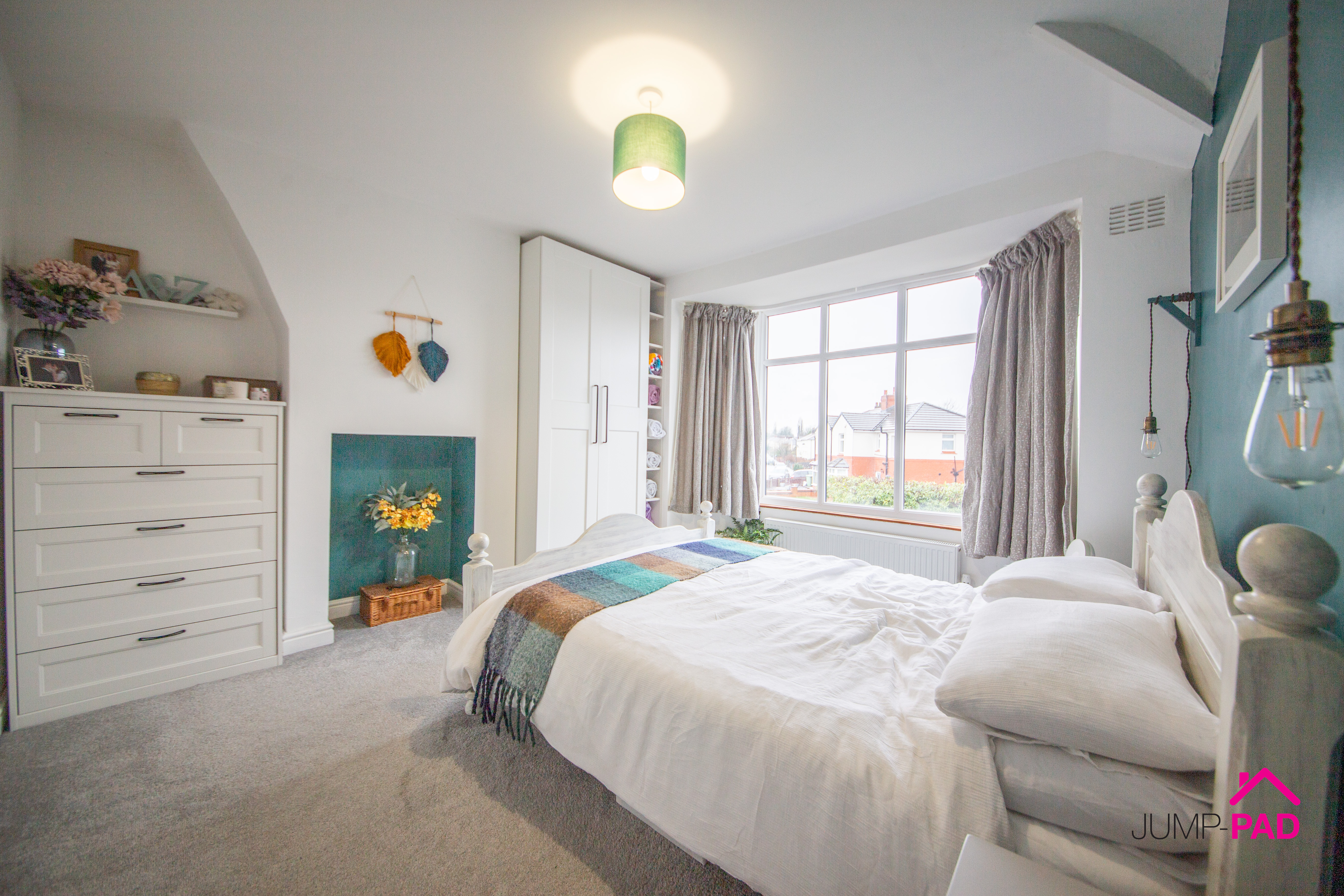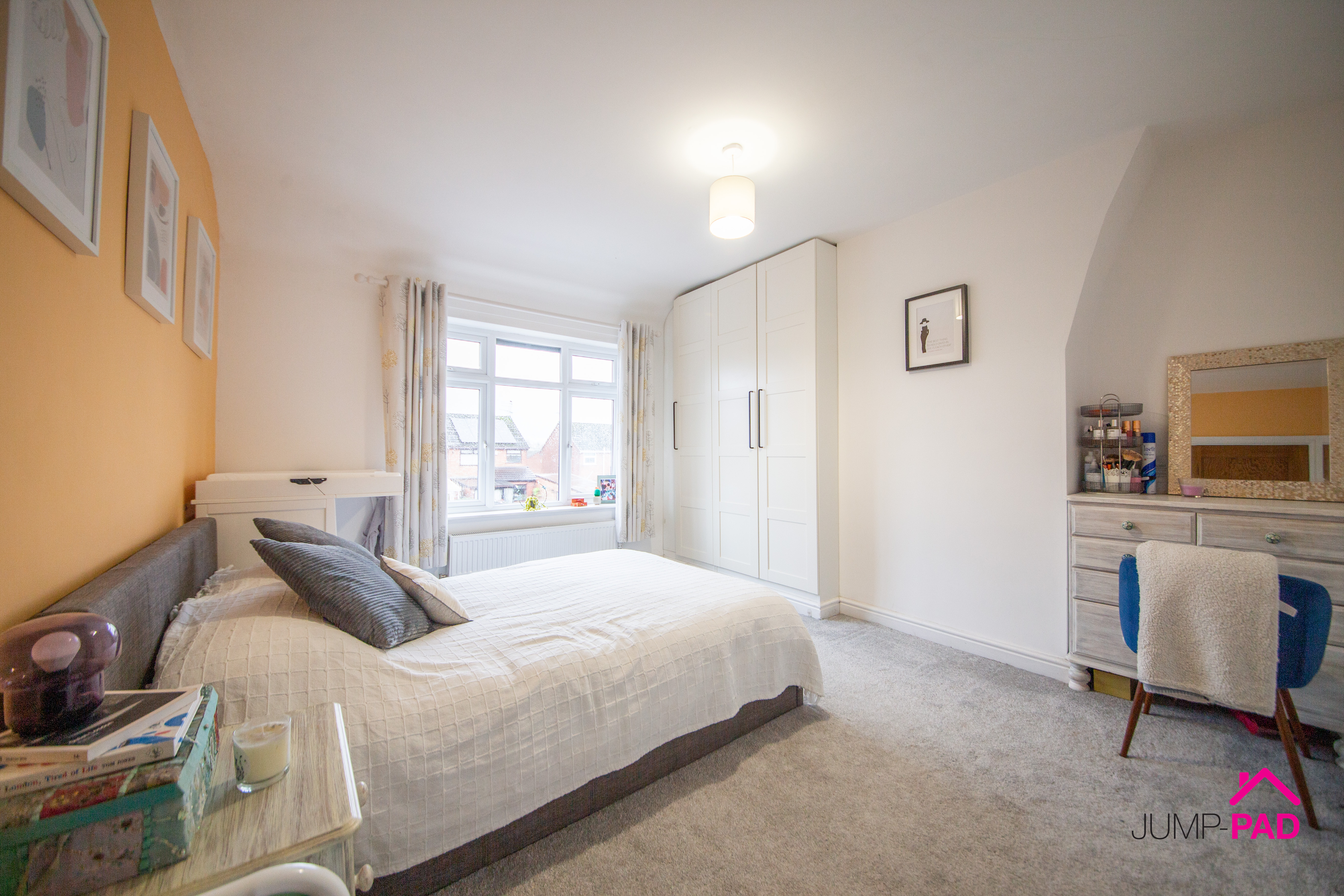 A generously sized master bedroom with a bay window providing plenty of natural light, with fitted wardrobes, grey carpet flooring and neutral decor.