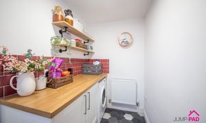 The utility room includes fitted storage with a wooden worktop, space for a washing machine, tile effect flooring, doorways to the garage and the rear garden, and plumbing for a downstairs bathroom.