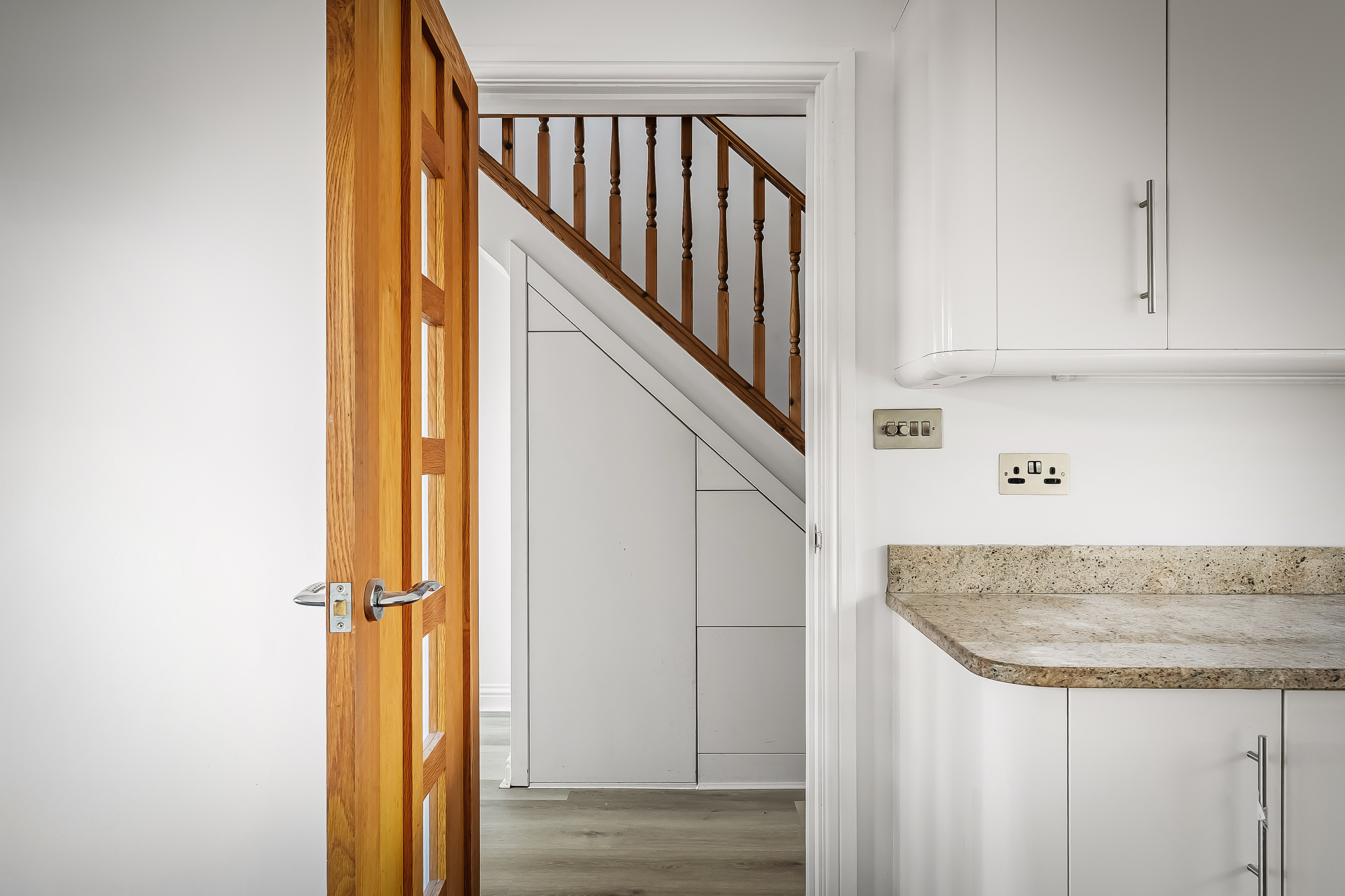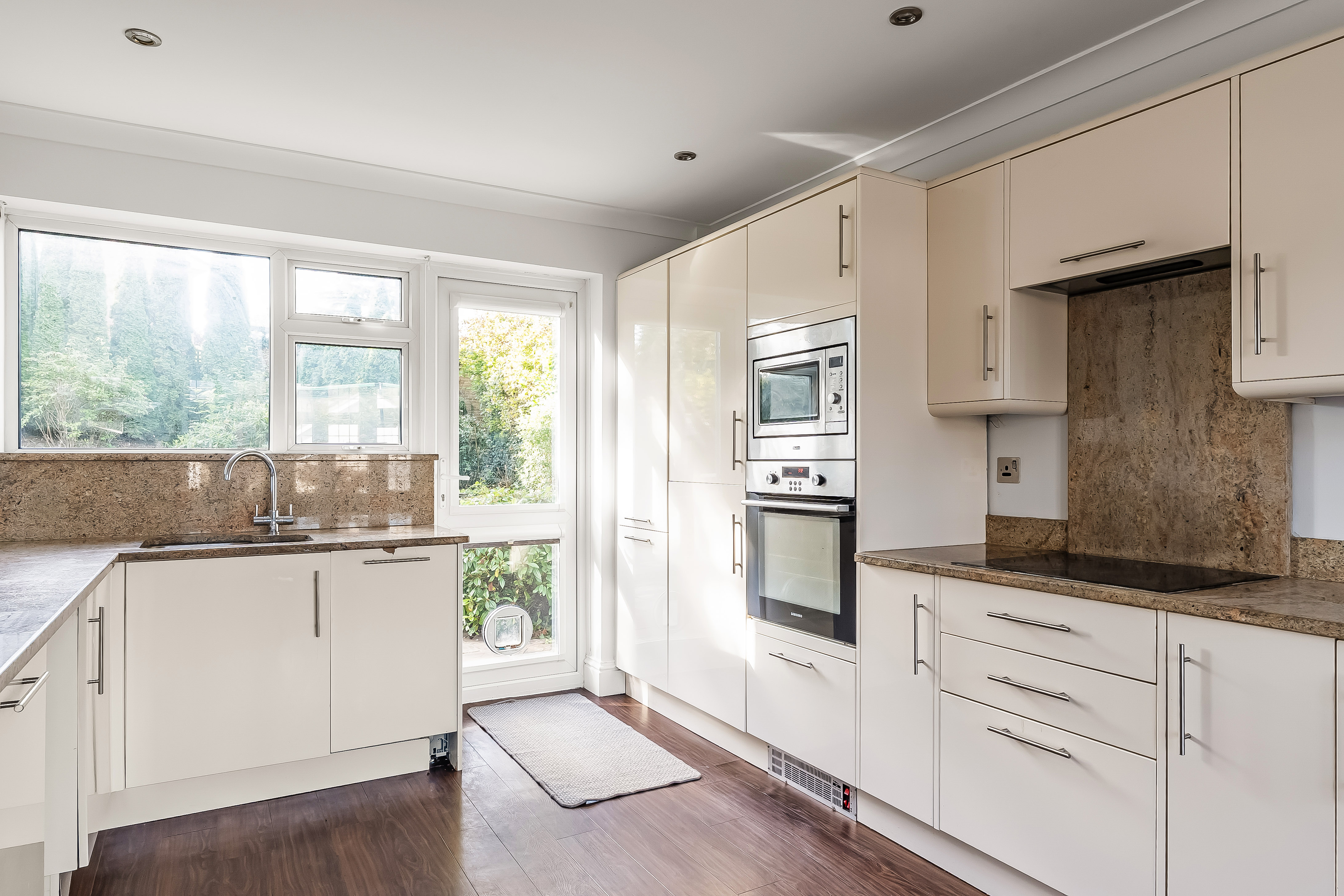 As you step into the welcoming entrance hall, you are greeted by a practical and stylish space that provides access to the ground floor's principal rooms. The thoughtfully designed kitchen/dining room is a highlight of the home, fitted with sleek high-gloss cabinetry, durable granite worktops, and integrated appliances, including a dishwasher, fridge freezer, and microwave. This space is perfect for culinary enthusiasts, with ample storage and preparation areas. The dining area, flooded with natural light from a large bay window, offers a seamless flow into the garden through a door leading to the terrace. Together, these spaces are ideal for family meals, casual entertaining, or simply enjoying the view of the garden.