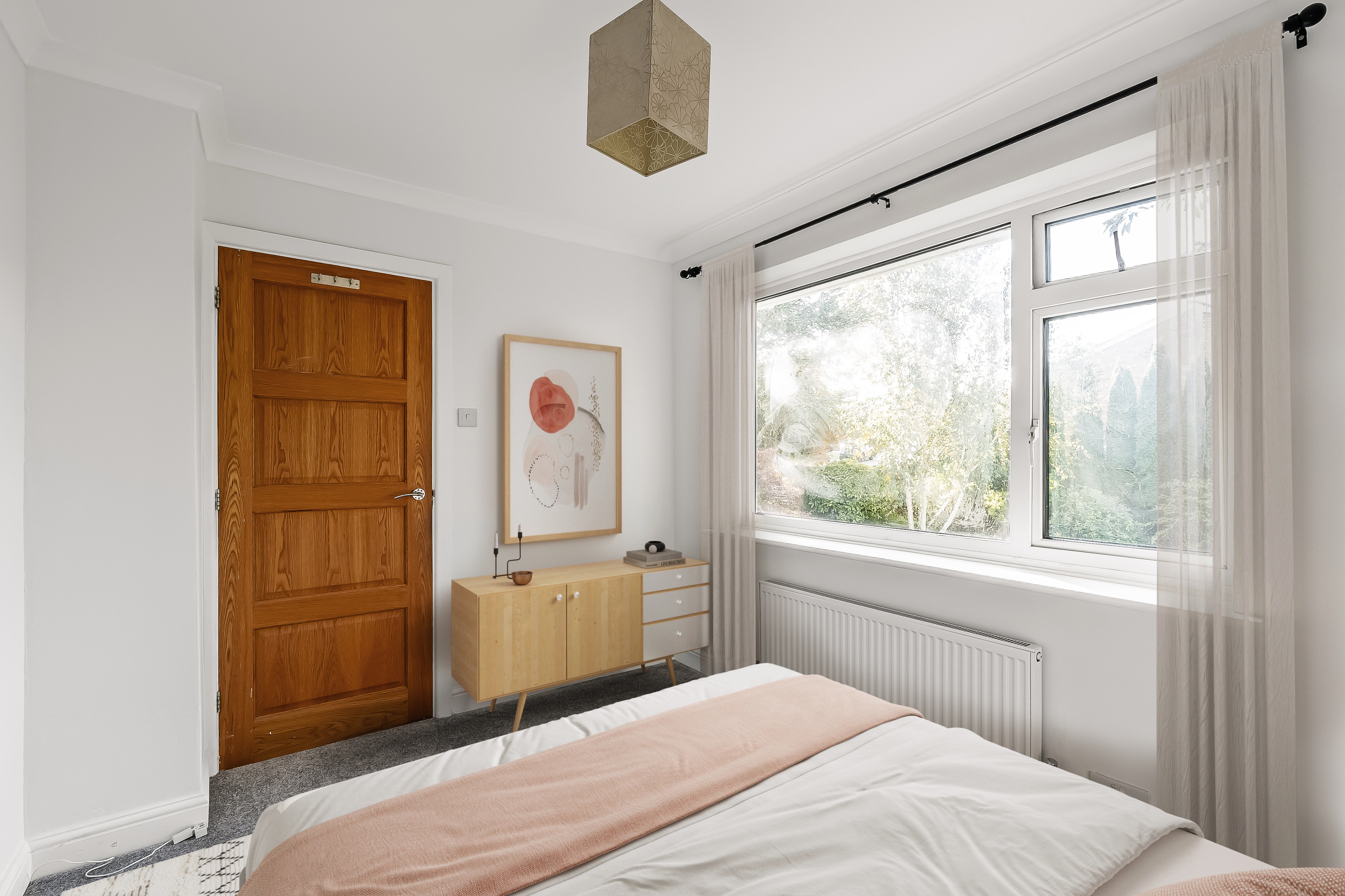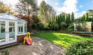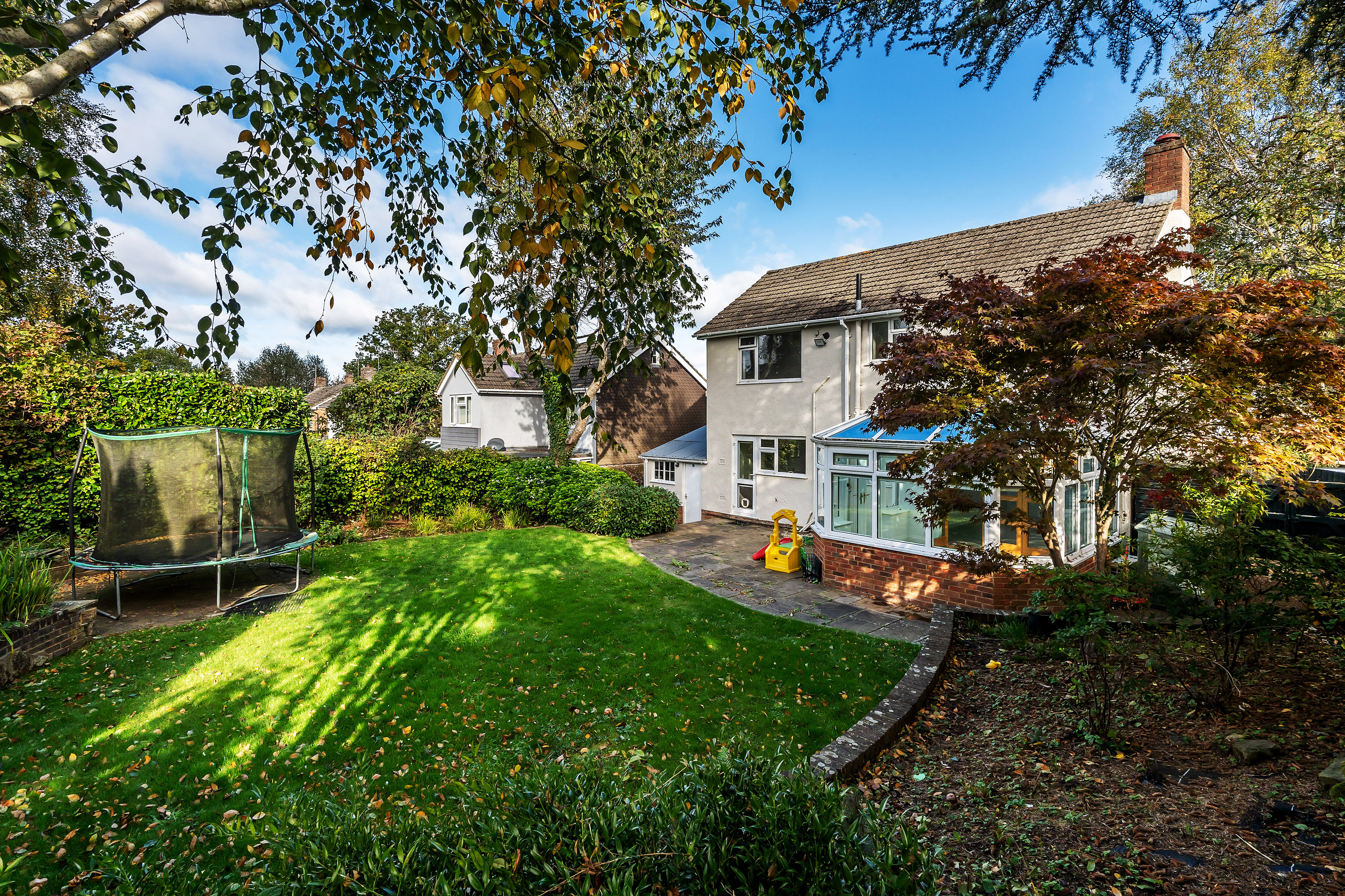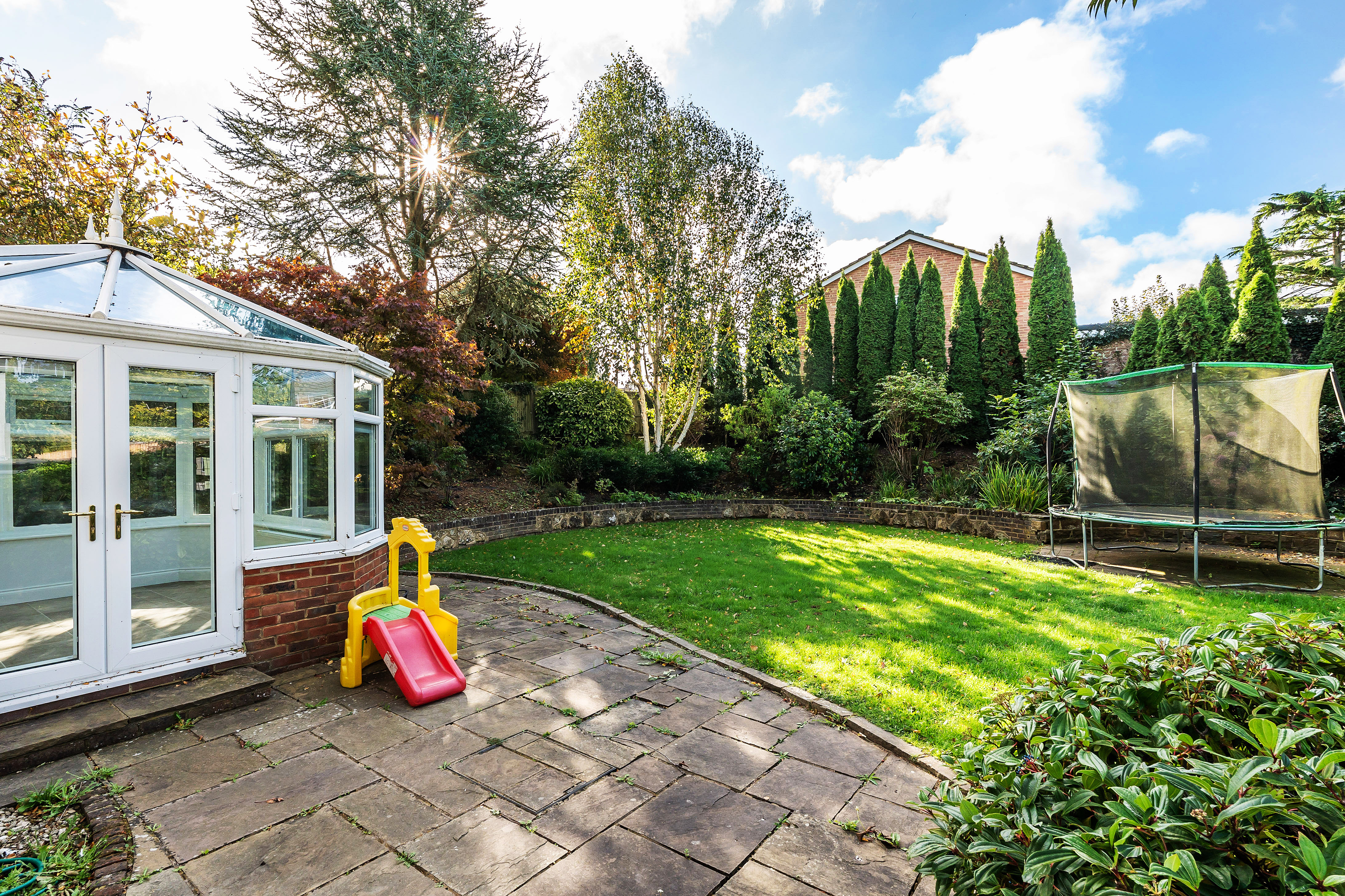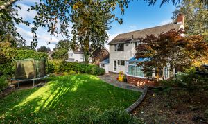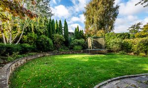 The rear garden is a private oasis, surrounded by mature trees and shrubs, including a striking snow birch and Japanese acer. The lawned area and herbaceous borders provide a serene backdrop, while two terraces offer ideal spots for alfresco dining or unwinding. The single garage can be accessed from the garden, while double gates provide practical side access to the property.