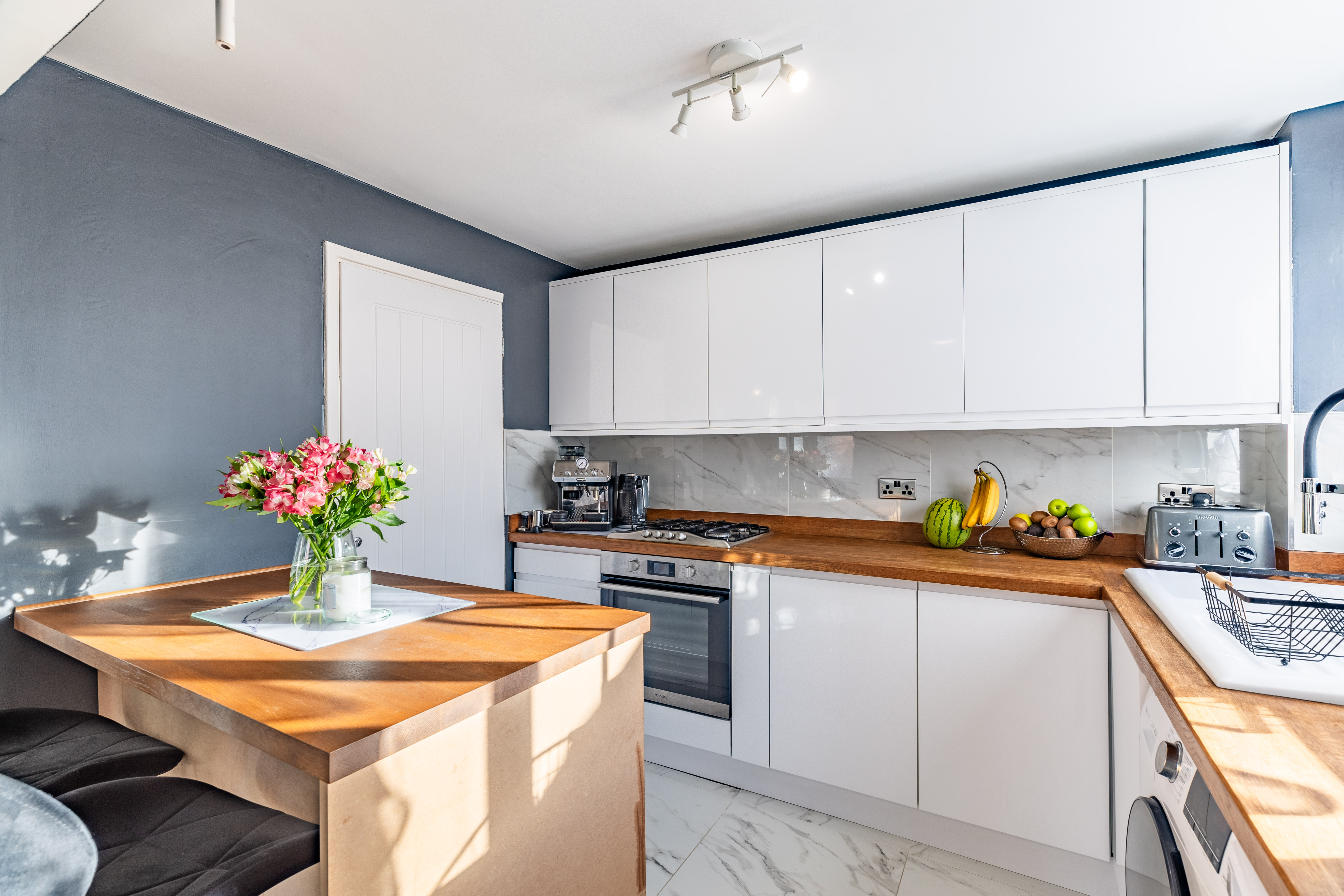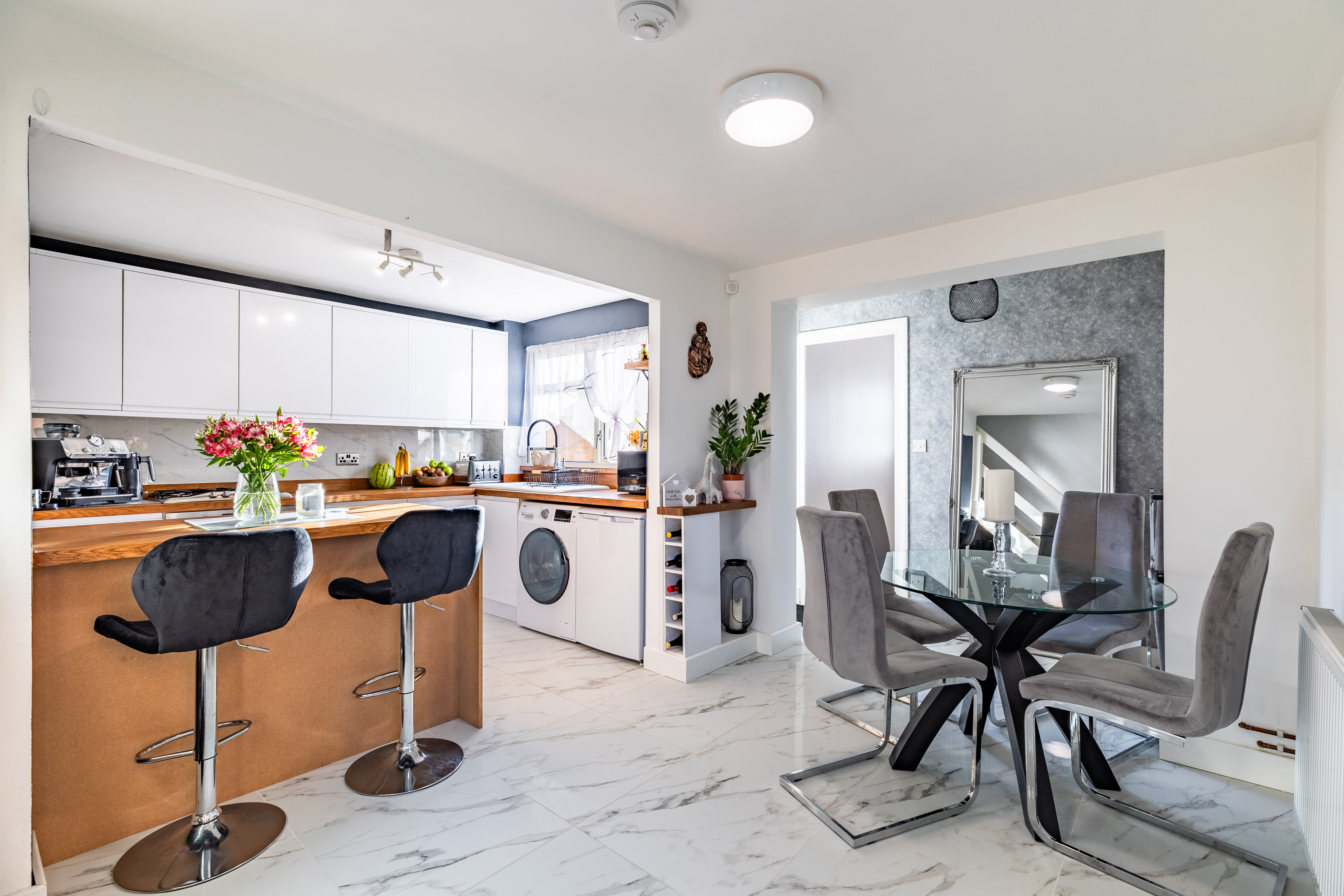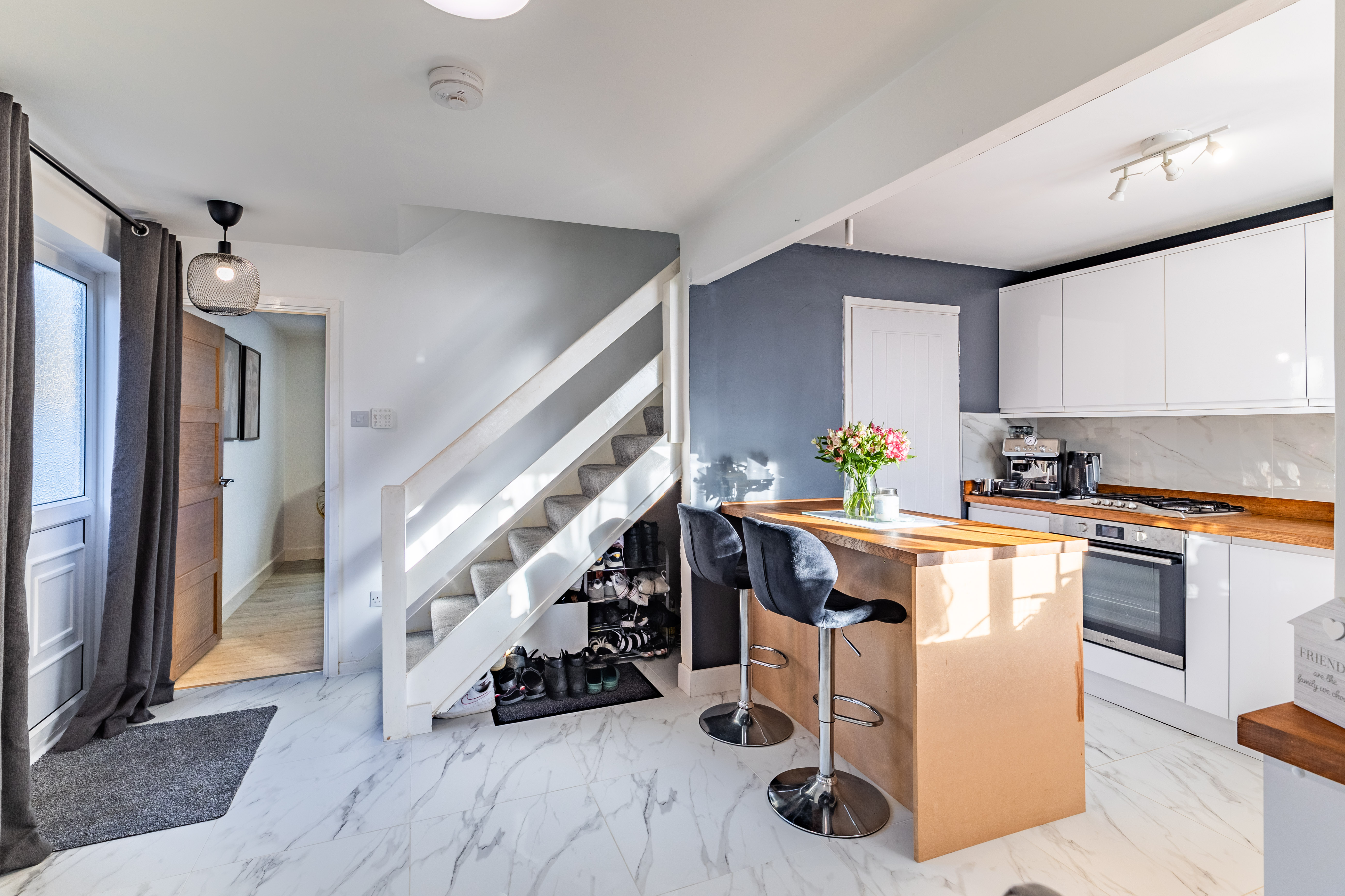 Enter the property into the bright, modern kitchen/diner (recently renovated in 2024), which features solid oak worktops, space for a washing machine and dishwasher, under-stair storage, and stylish tile flooring. The fully refurbished living room offers a cosy and welcoming atmosphere, while the downstairs extension provides a space that’s ideal for a home office, gym, or extra bedroom.
