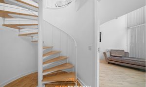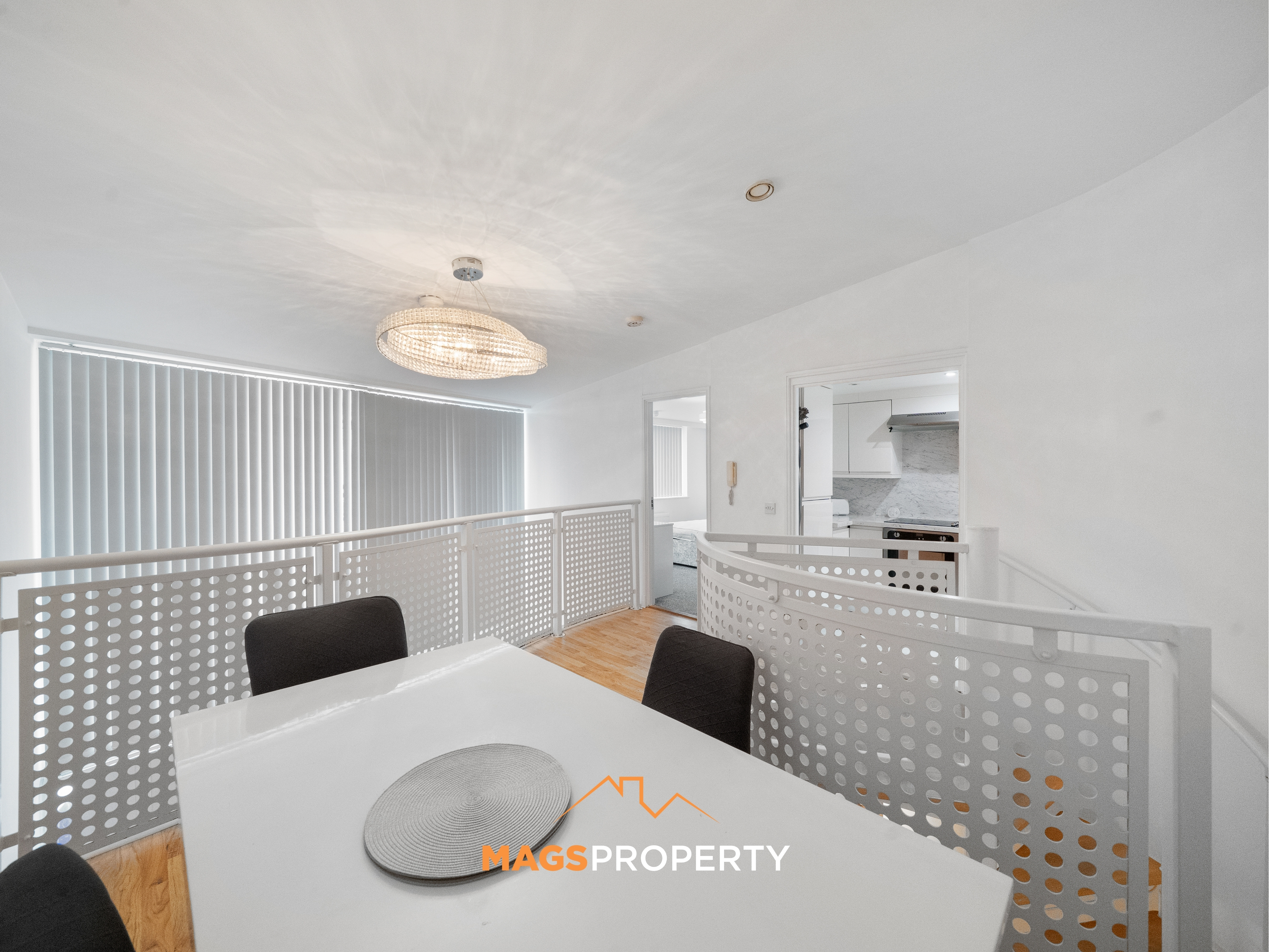 Ascend to the second floor and discover the bright and airy heart of the home. Here you’ll find the master bedroom with en-suite, a well-equipped kitchen and a stunning mezzanine balcony dining room that overlooks the living space below — ideal for dinners, gatherings and soaking up city views. The apartment also comes with an allocated car space.
