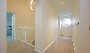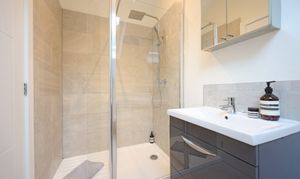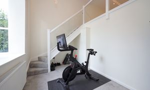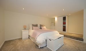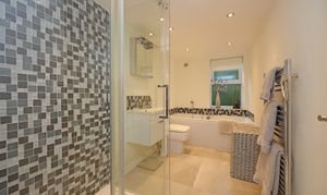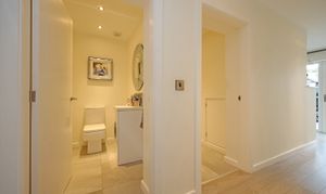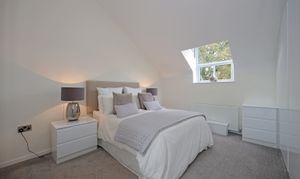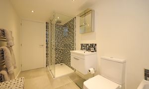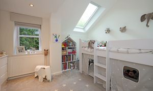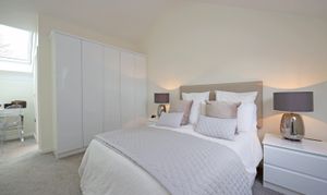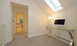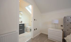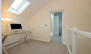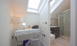 The first floor landing area features a circular window and gallery landing space large enough to be utilised as a study area with apex ceiling and skylight. Beyond this landing area is the guest bedroom or alternative master suite, incorporating a dressing area with skylight window and fitted with wardrobe units to two walls with matching drawer/bedside cabinets. A further feature window overlooks the front aspect. There is an ensuite shower room incorporating walk-in shower with contrasting tiling to walls and main thermostatic shower in addition to a vanity wash basin and WC.