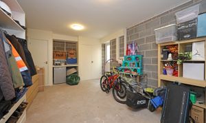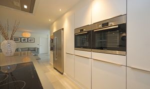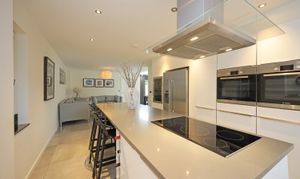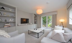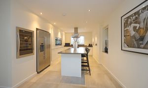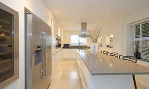 Secure vehicle access with remote siding security gate and high wall enclosure with block paviour parking for several vehicles. Glazed entrance door/side panel opening to a reception hallway with glass balustrade return staircase to the first floor. Internal access to a large integral garage with remote roller door, external side access and store cupboards housing the central heating system which includes underfloor heating to the ground floor. The hallway continues to a purpose built utility with gloss base/wall units and integrated plumbing provision for washing/dryer facilities. There is also a separate cloakroom with WC and vanity wash basin off the hallway. At the end of the hall, a glazed door opens to a superb open plan family dining kitchen with large format tiled flooring running throughout the entire room. The kitchen area is comprehensively fitted with an extensive range of gloss units and granite work tops having inset one and a half sink and an integrated dishwasher. A matching built in tall range with larder cupboards has centrepiece twin side-by-side electric fan ovens, with a recess for a freestanding American fridge freezer and feature inset wine chiller. There is also a large centrepiece island with matching work surfaces extending to a breakfast bar with pan drawer/cupboard units beneath. Windows overlook the front and side aspect, with feature full height corner glazing incorporating bifold door access opening onto the rear garden within the suggested dining area. This area also has a vaulted ceiling and feature gallery landing overlooking from above. A door from the family area leads to a relaxing lounge, fitted with display/storage units to a media wall, with a window and additional patio door access onto the garden.