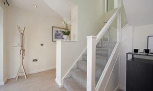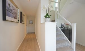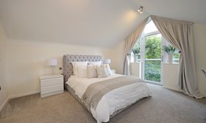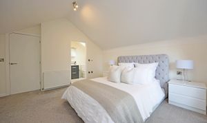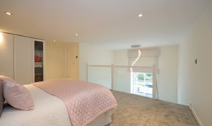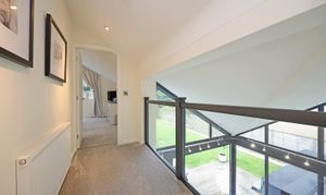 Returning back to the main landing there is another galleried outlook onto the family dining area below. The master bedroom situated to the rear of the property, with a vaulted ceiling enjoys a glazed apex window incorporating Juliet balcony overlooking the rear garden. It is fitted with a dressing table and bedside cabinets and a matching style ensuite incorporates another walk in shower with contrast tiling to walls, vanity wash basin and WC. The two remaining bedrooms ideally suited for a growing family comprise a further feature bedroom with double height window and staircase with glass balustrade to a mezzanine level sleeping area, fitted with matching style wardrobe, shelving and drawer units. The fourth double bedroom has further fitted wardrobe/drawer units and a window to the side elevation with additional skylight within a partial vaulted ceiling. Between these two bedrooms there is a luxury family bathroom with feature tiling and comprises a four piece suite with bath, walk in shower, wall hung vanity wash basin and WC.