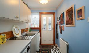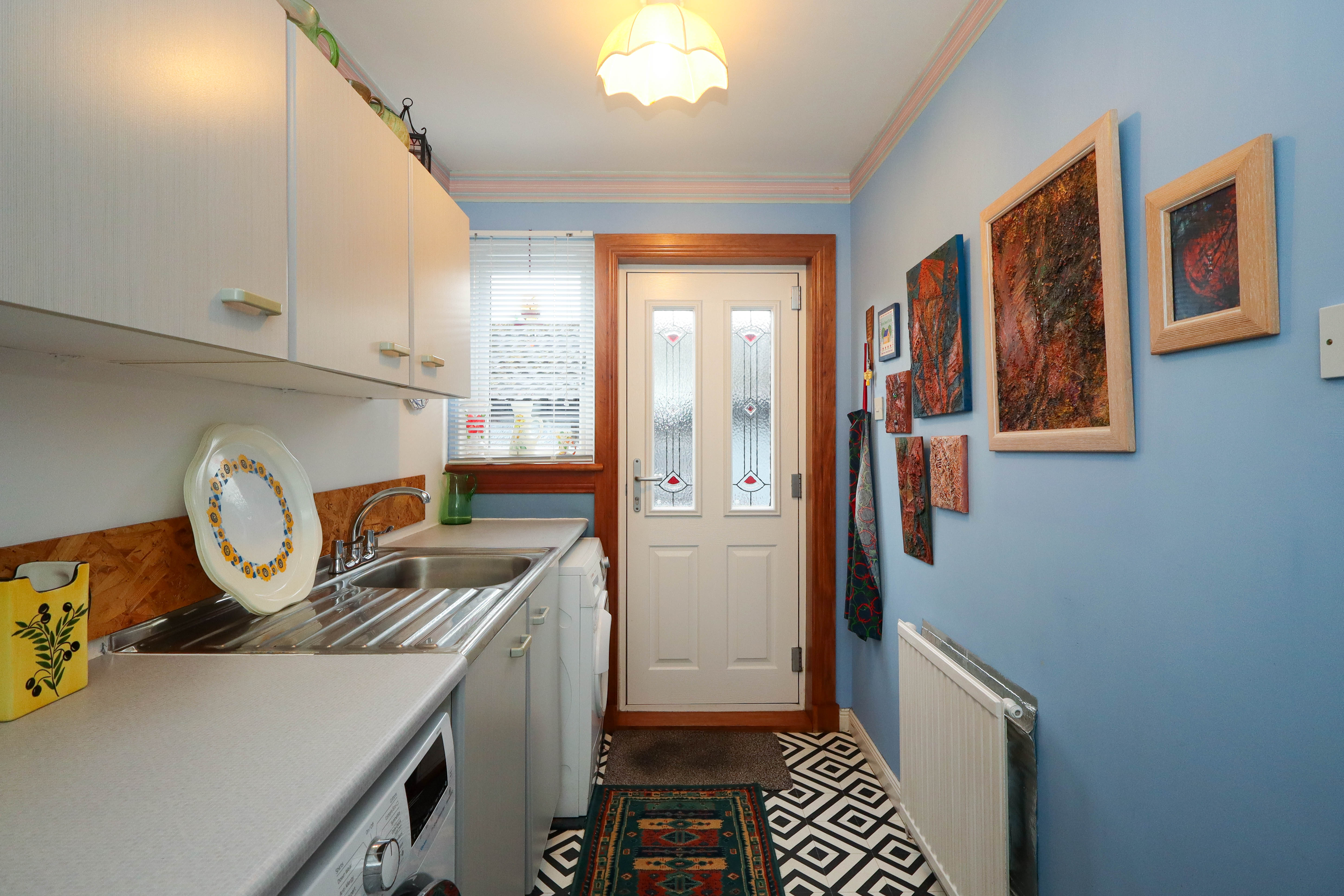 2.986m x 1.593m (09’09” x 05’02”) This practical room is accessed from the kitchen or the hallway. The grey fronted units provide storage space and there is a co-ordinating work surface. Decorated with painted walls, tiled splashbacks and tiles to the floor. There is space for an under counter washing machine and tumble dryer. Natural light enters from the window and half-glazed door to the rear of the property, with the addition of ceiling lighting. A stainless-steel sink with drainer and taps, a radiator and power points complete this area.