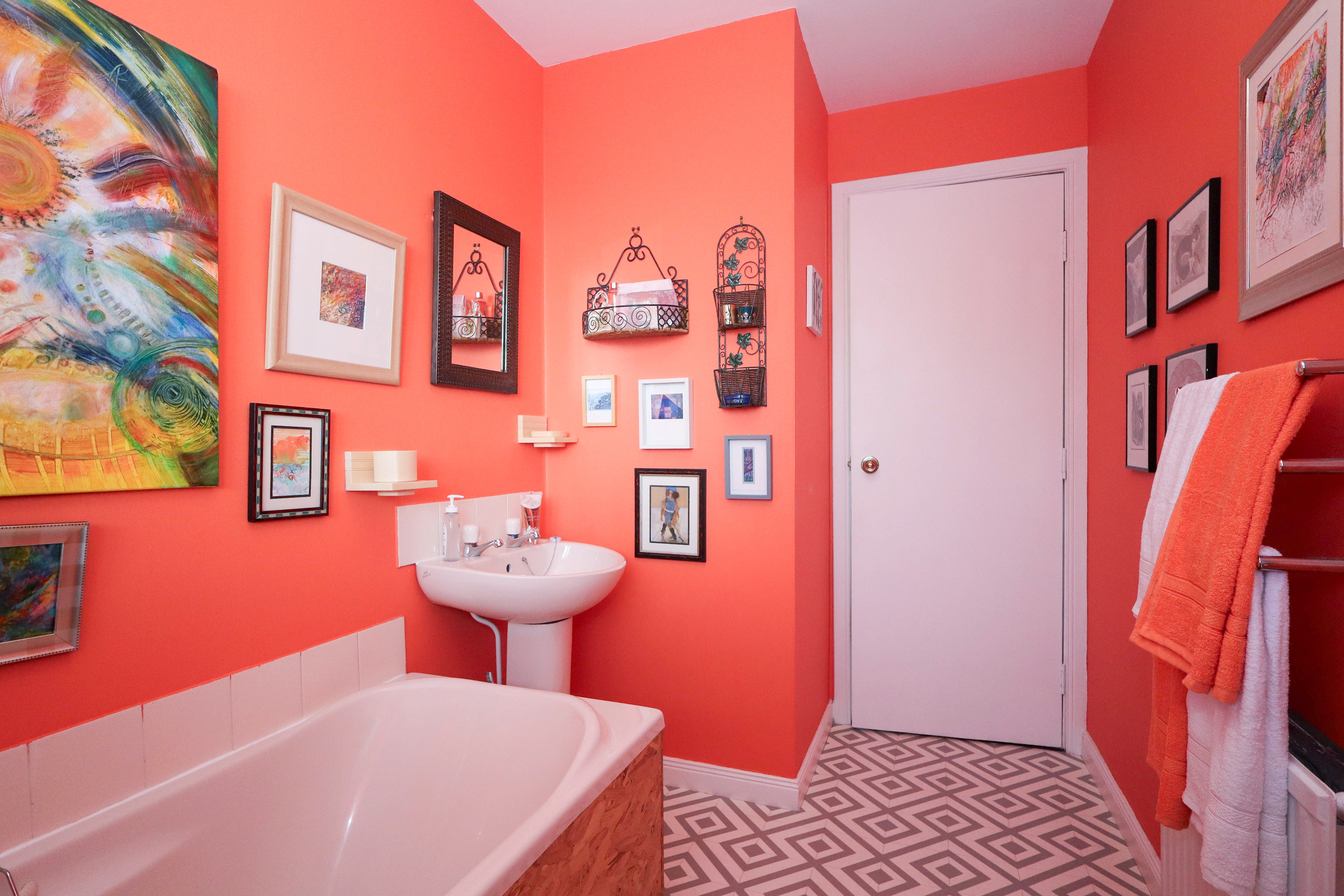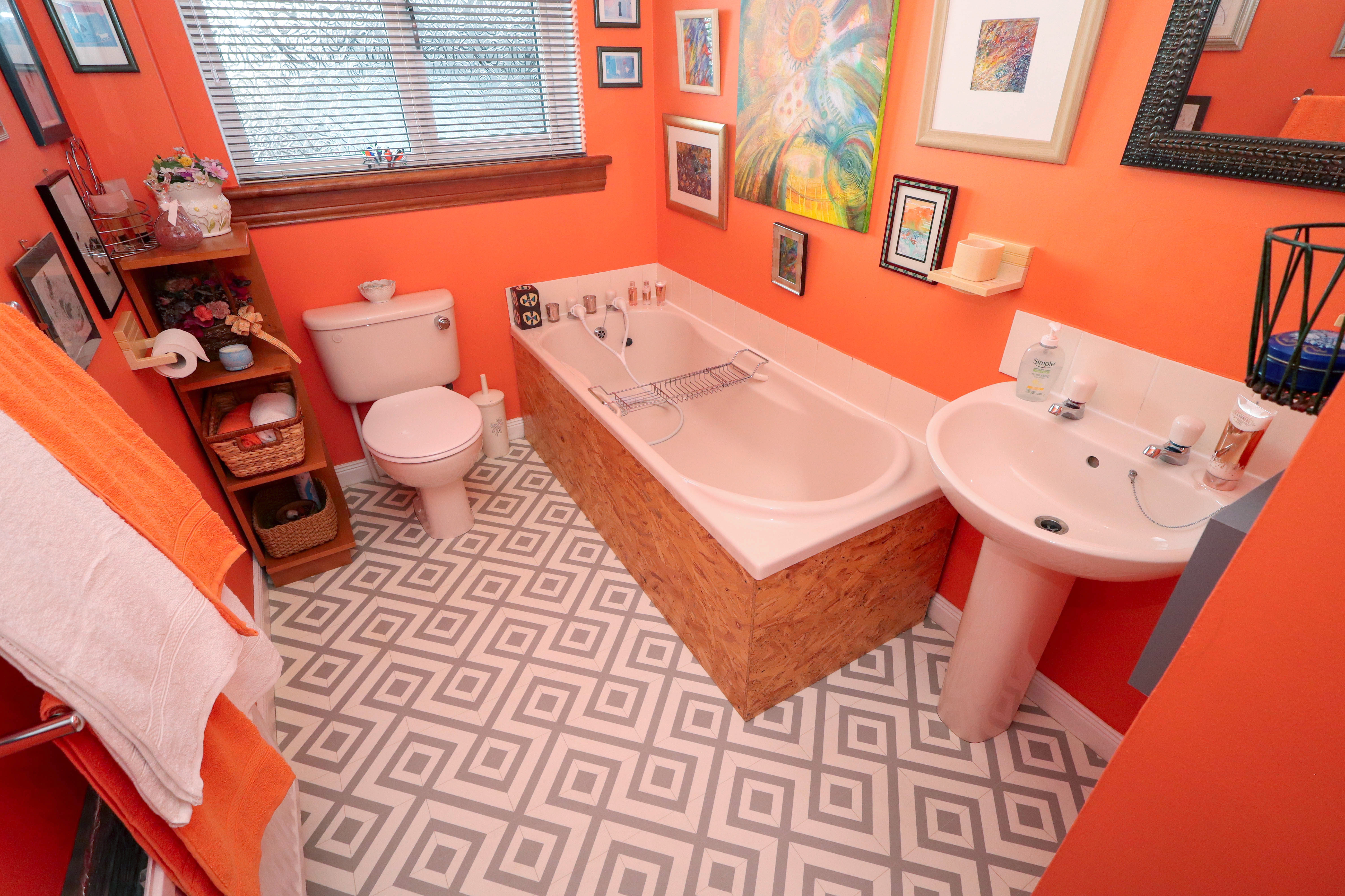 2.263m x 1.648m (07’05” x 05’04”) This vibrant room has been mainly finished with painted walls, some tiled splashbacks and tile effect vinyl to the floor. The suite comprises of a bath, a close coupled toilet and a pedestal sink. A window to the rear of the property allows natural light into the room and there is ceiling lighting. A radiator is also provided.