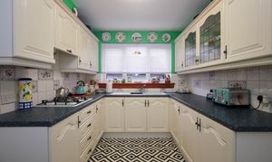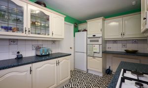 3.753m x 2.387m (12’03” x 07’10”) This delightful room oozes character and charm with lots of wall and floor mounted units with white frontages and co-ordinating work surfaces. Decorated with painted walls, tiled splashbacks and tiled flooring. There is an eye level integrated double oven, a four-ring gas hob and a cooker hood, which will all be included in the sale. There is space for an upright fridge-freezer. Natural light enters from the windows to the rear of the property, with ceiling lighting complementing this. A white one and a half sink with mixer tap and drainer, a radiator, a heat detector and power points complete this area.