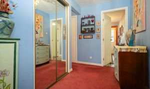 2.939m x 2.275m (09’07” x 07’05”) This charming room is currently used as a study and has been finished with neutral tones to the walls and has carpeted flooring. The window to the front of the property allows in natural light and this is further complemented by a ceiling light. Double mirror fronted wardrobes provide hanging and shelving space. A radiator and sockets complete this area.