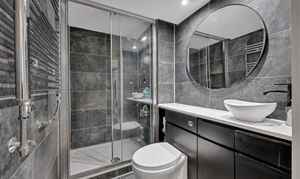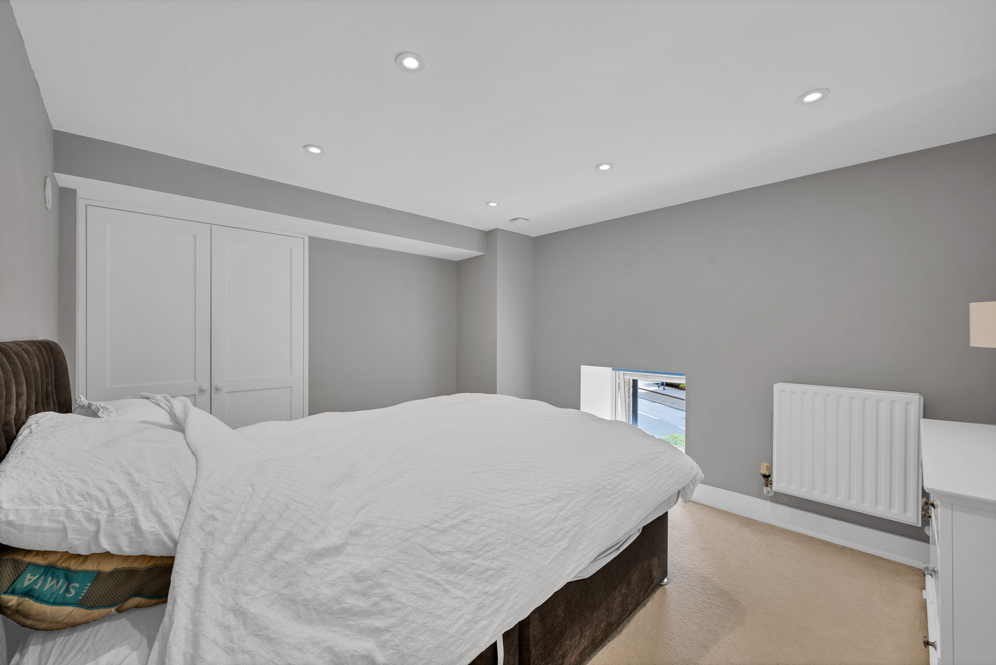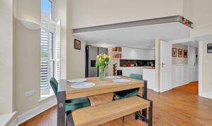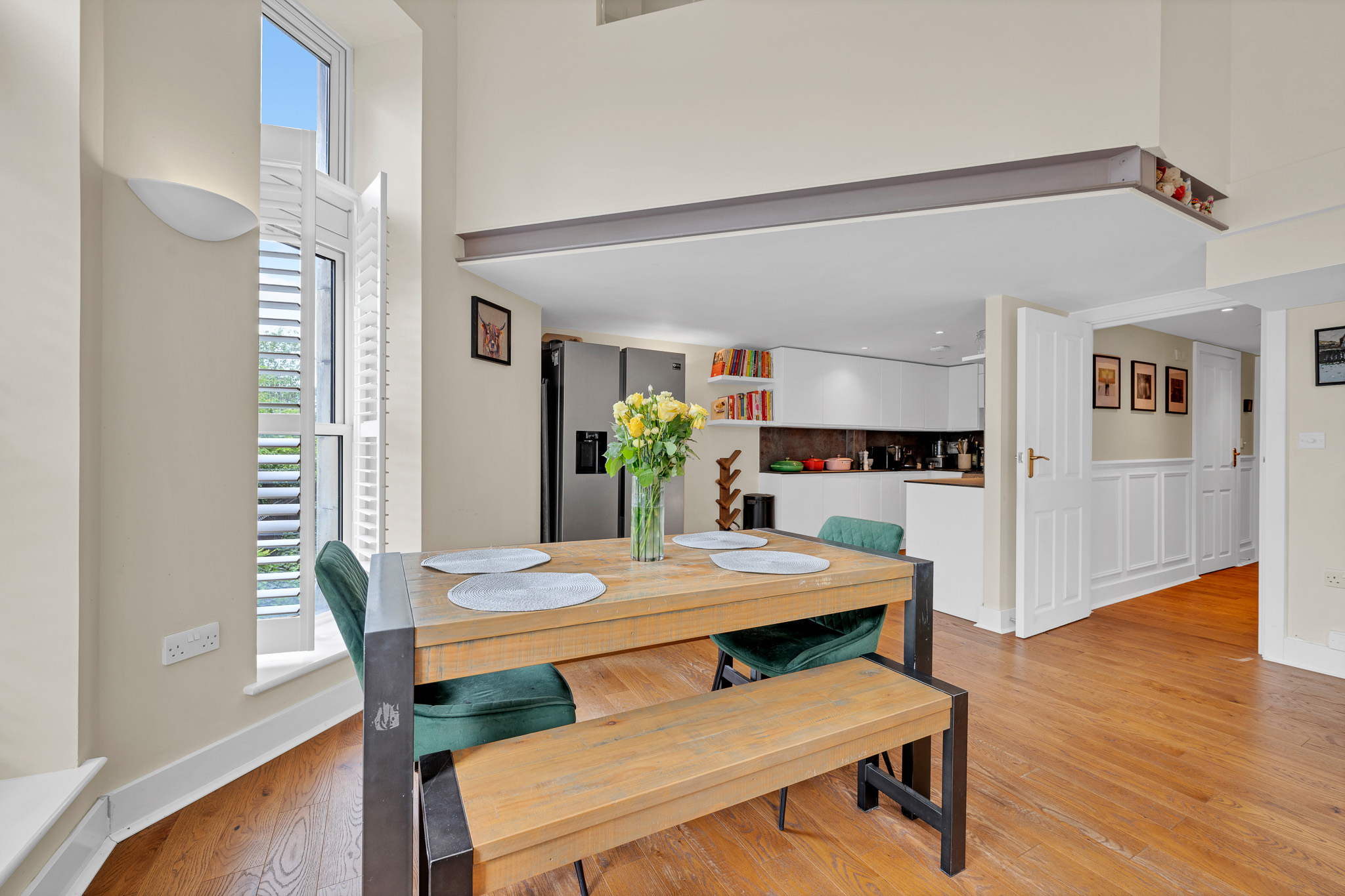 Located on the ground floor, in a favoured raised position above street level, the accommodation comprises entrance hall leading into the open plan reception/kitchen with impressive double height ceiling to the reception area, and ample space for relaxing, entertaining and dining. The kitchen area comprises a modern range of matching wall and base units with work surfaces and breakfast bar area, incorporating inset sink unit, induction hob with overhead extractor, wall mounted electric oven, and further space for appliances. The lower level also accommodates a generous double bedroom, plus bathroom with modern suite and elegant tiling. To the upper level, there are two further well sized double bedrooms, and a further luxury bathroom.