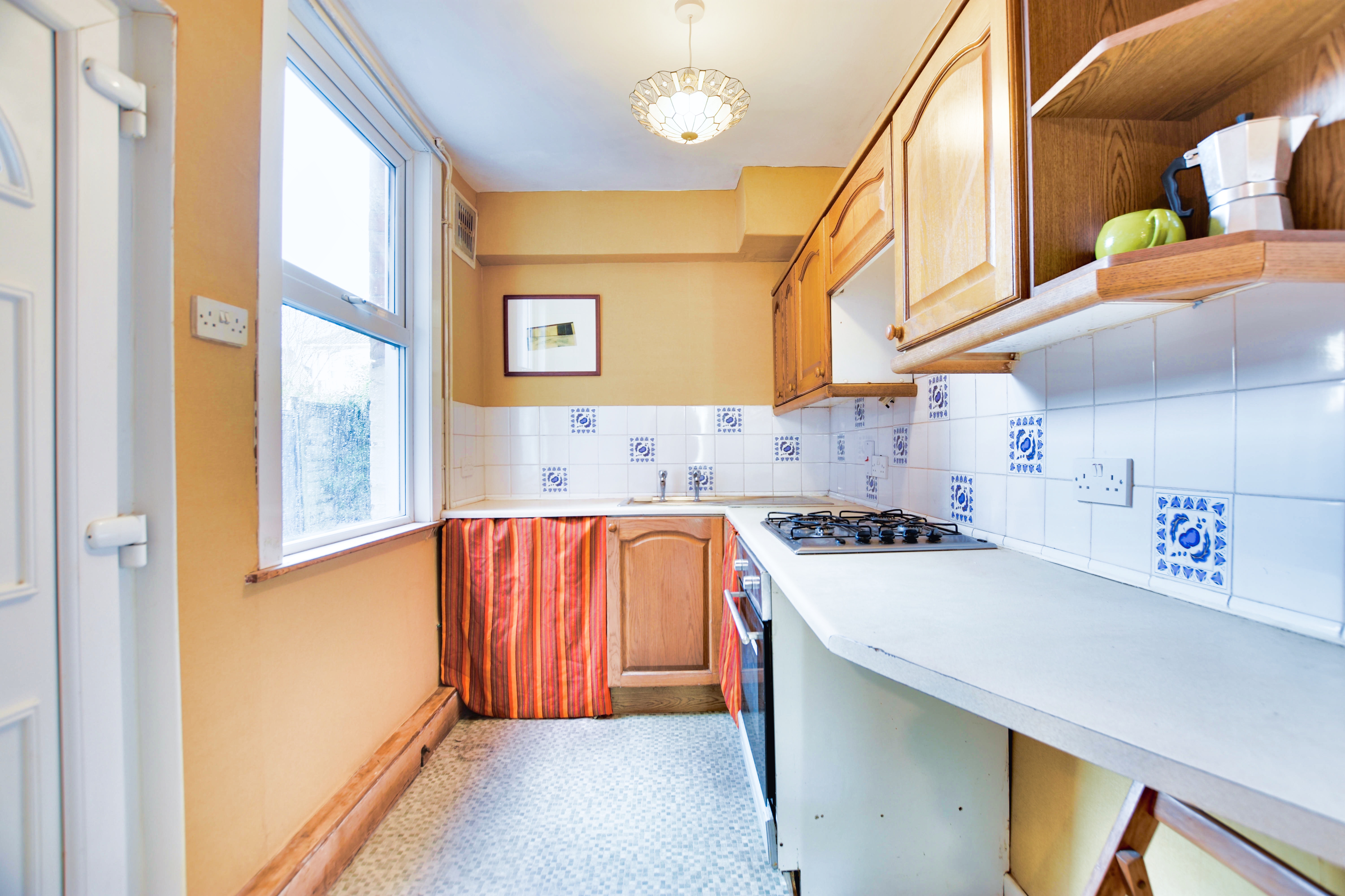 With a double-glazed window to the side elevation, a double-glazed door to the side elevation, stainless steel sink and drainer unit with radiator, boiler, base and split work surfaces over, built-in oven and gas hob, space for washing machine, radiator.