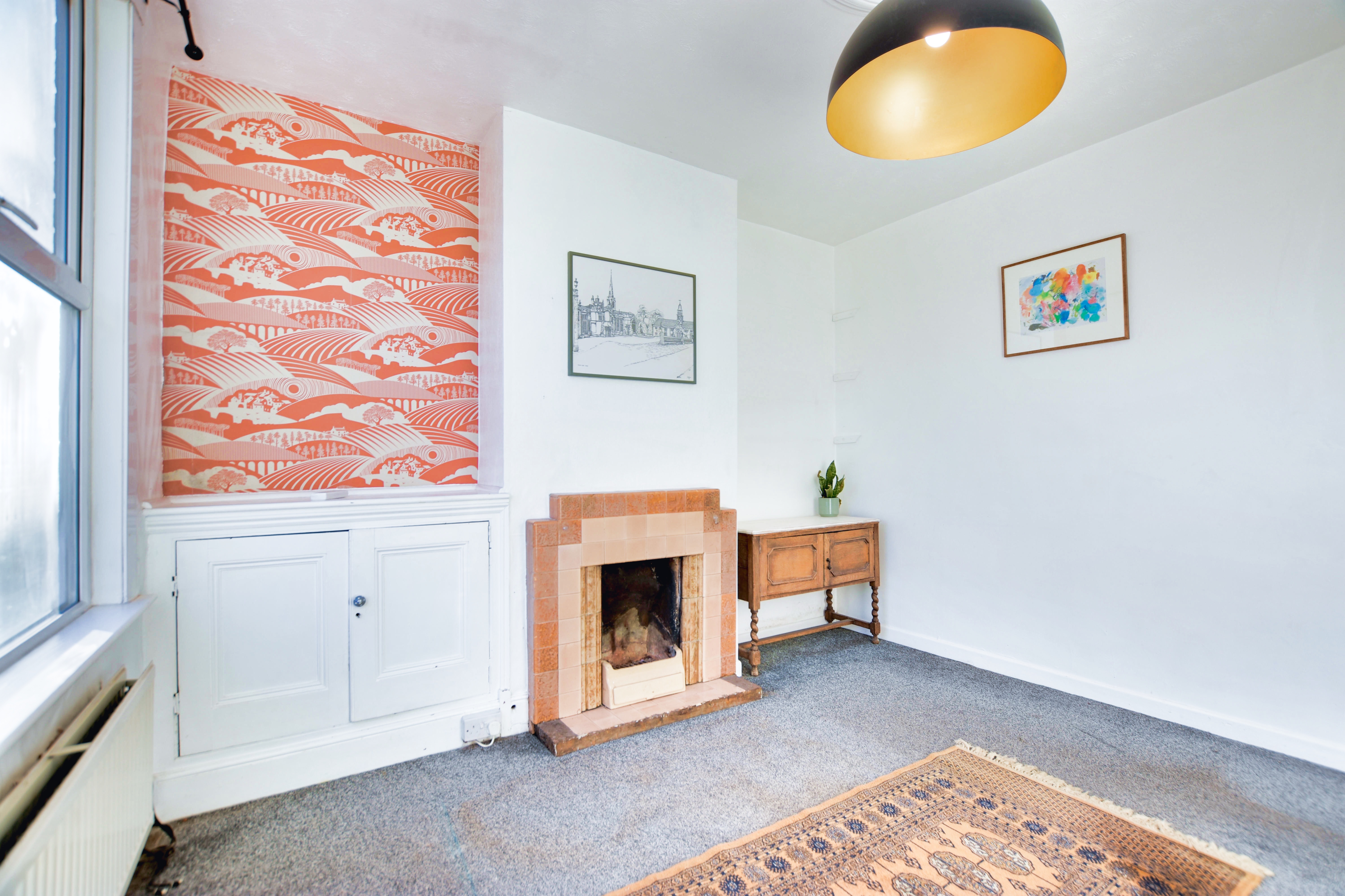 With a double-glazed window to the front elevation, a meter cupboard, a fireplace, and a radiator.