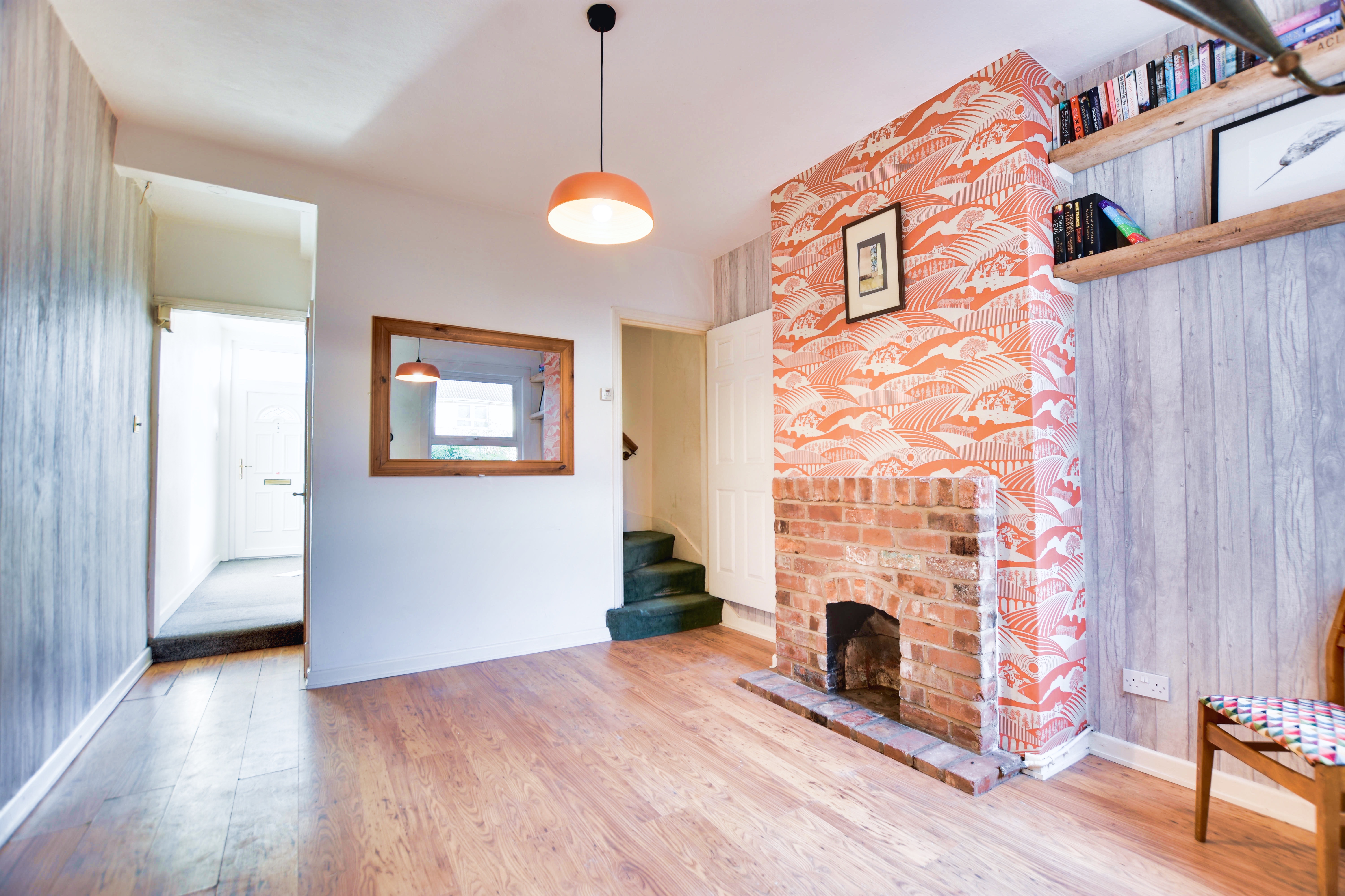 With a double-glazed window to the rear elevation, stairs to the first floor with an understairs storage cupboard, a feature brick fireplace, laminate flooring, radiator.