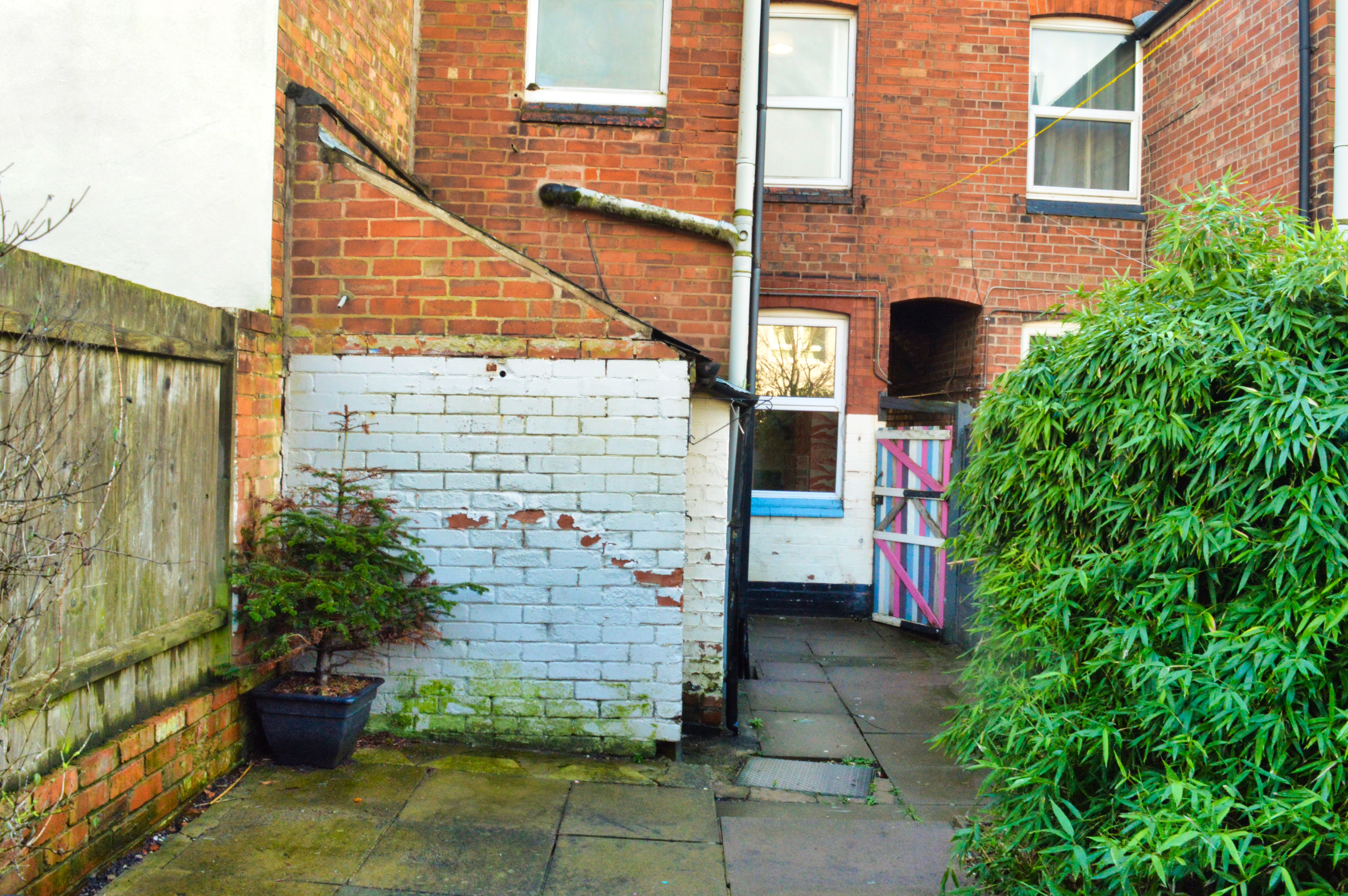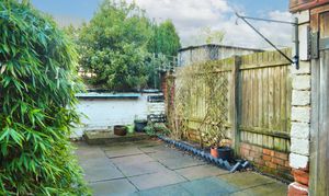 With an outside store, paved with some shrubs to borders, partly fenced and walled perimeter and a gate to a side passage.