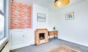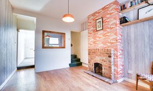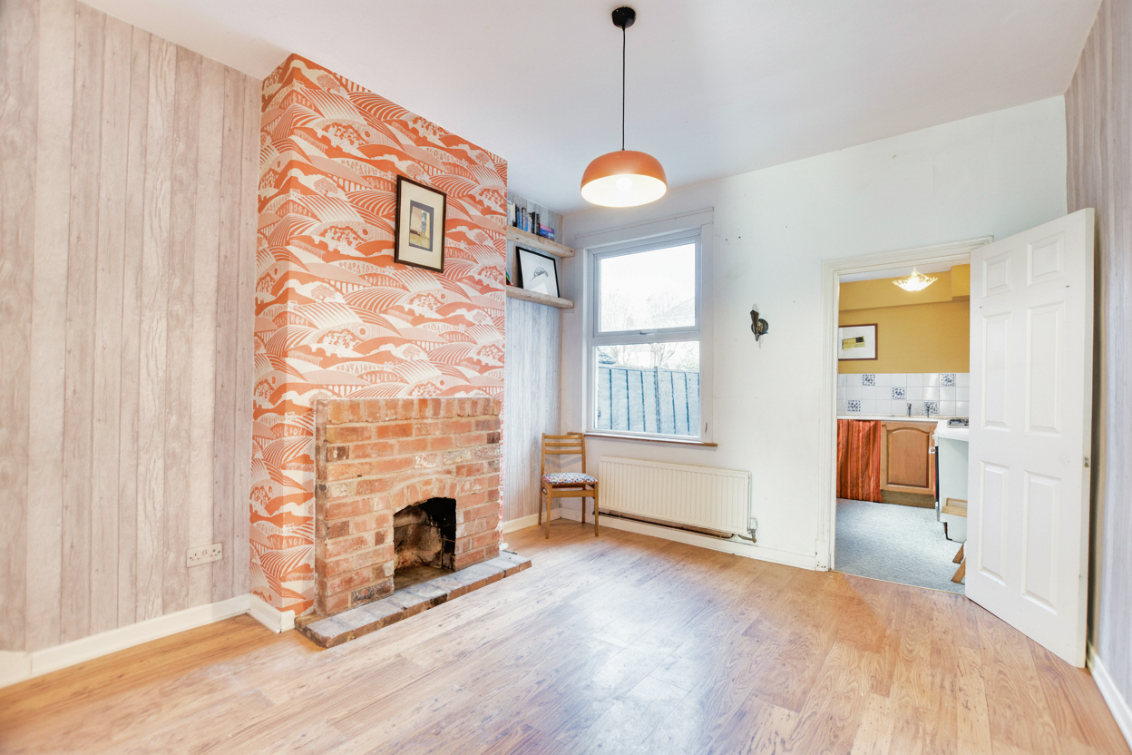 The property opens into Reception One positioned to the front of the home, featuring a double-glazed window, fireplace, meter cupboard and radiator. Reception Room Two sits to the rear and includes a feature brick fireplace, laminate flooring, radiator and stairs rising to the first floor with useful under-stairs storage.