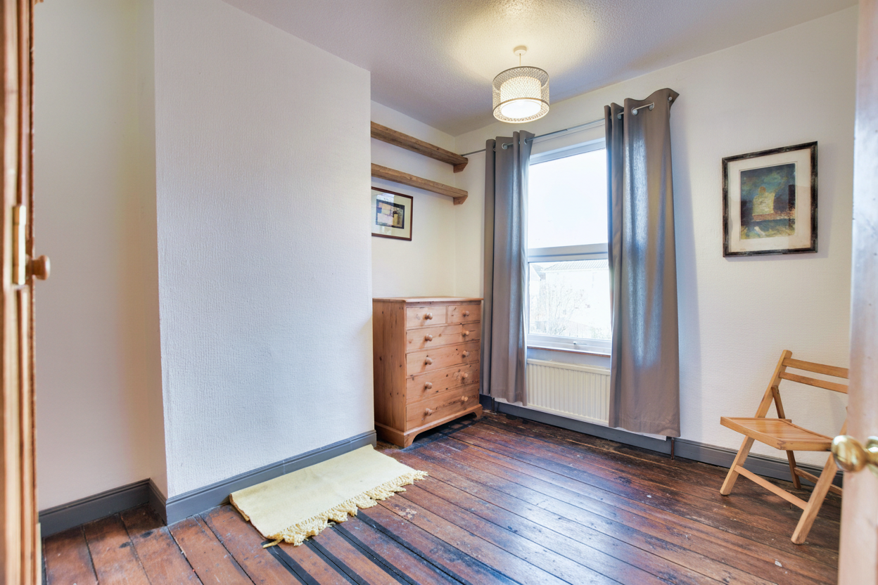 To the first floor, Bedroom One is located to the front and benefits from fitted wardrobes. Bedroom Two overlooks the rear and includes a built-in cupboard and boarded flooring. The bathroom is fitted with a bath and shower over, pedestal wash hand basin and low-level WC.