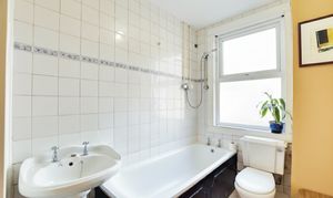 With a double-glazed window to the rear elevation, bath with shower over, pedestal wash hand basin, low-level WC, cupboard housing boiler, lino flooring and a radiator.