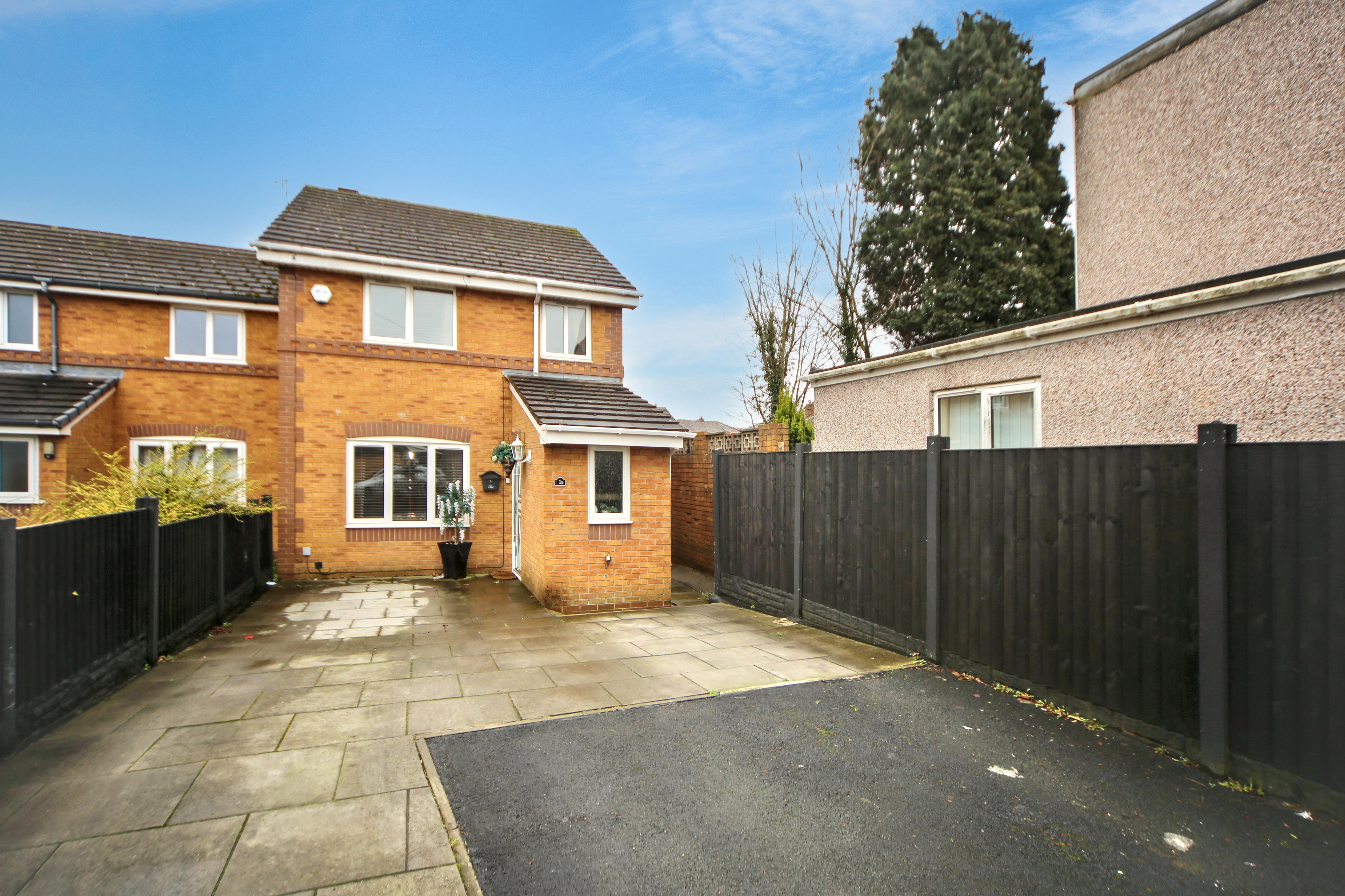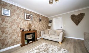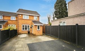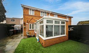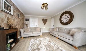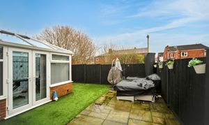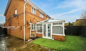 The home benefits from a large driveway to the front, providing ample off-road parking for several cars. A welcoming entrance hallway leads to a convenient ground floor WC, a generous lounge, and a kitchen/diner that provides plenty of space for family meals and entertaining. A bright conservatory overlooks the rear garden, creating an ideal spot to relax while enjoying a mix of paving and low-maintenance artificial lawn.