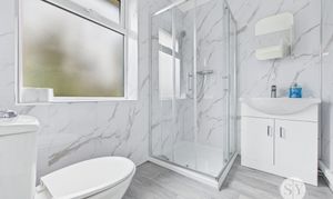 Vinyl flooring, three piece in white comprising of wc, basin with vanity cupboard, mains fed shower enclosure, frosted double glazed uPVC window, towel radiator.