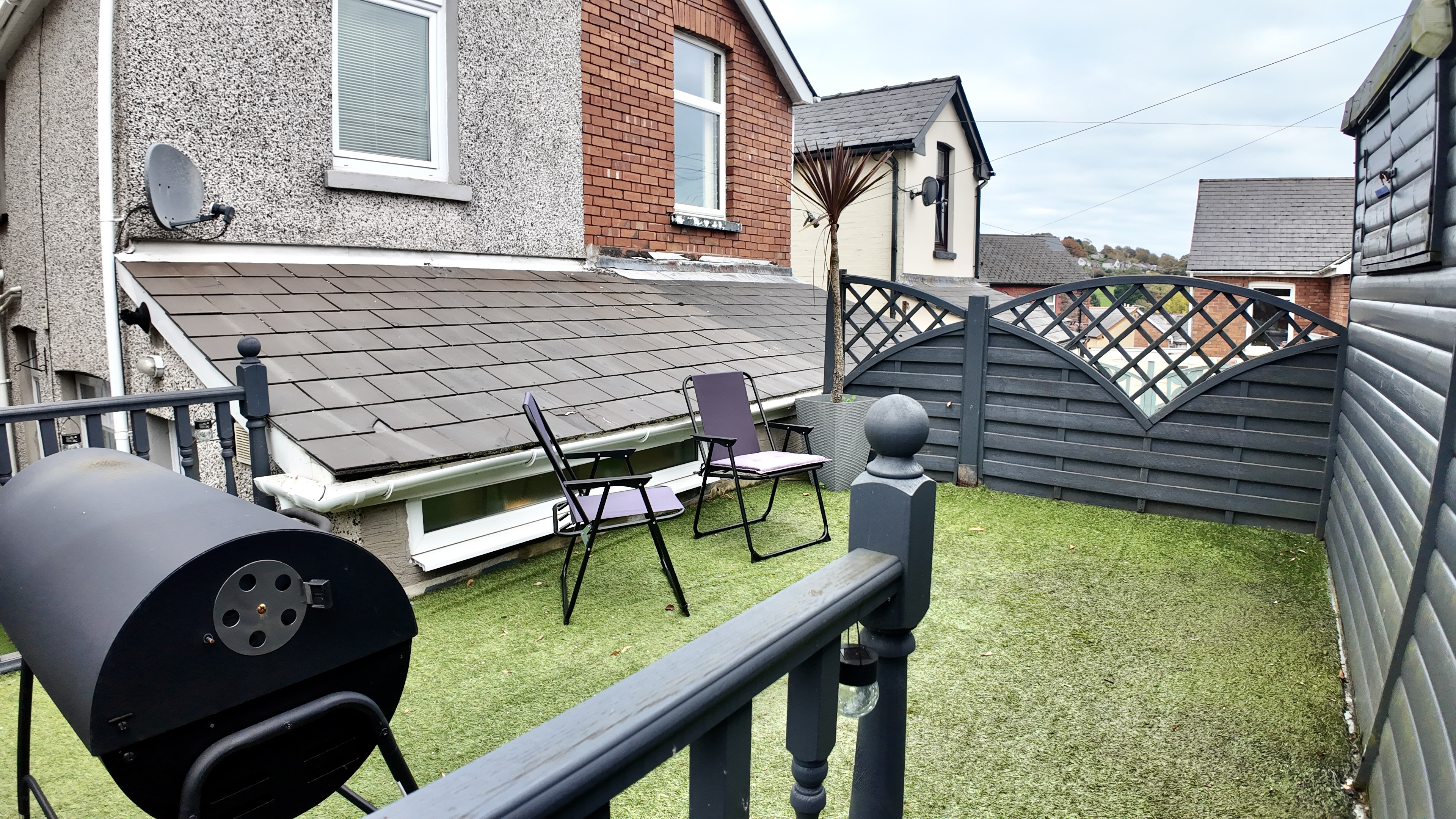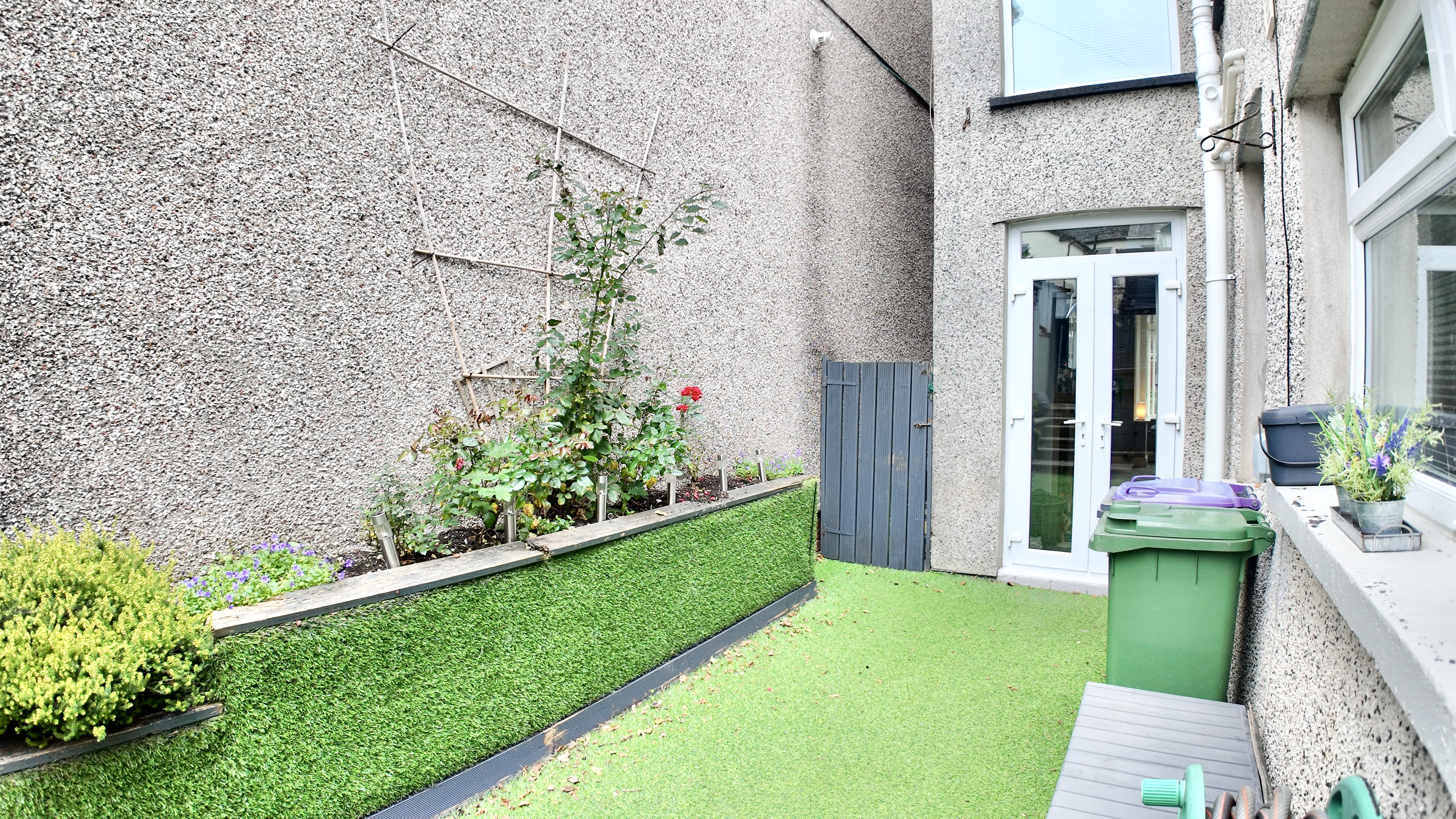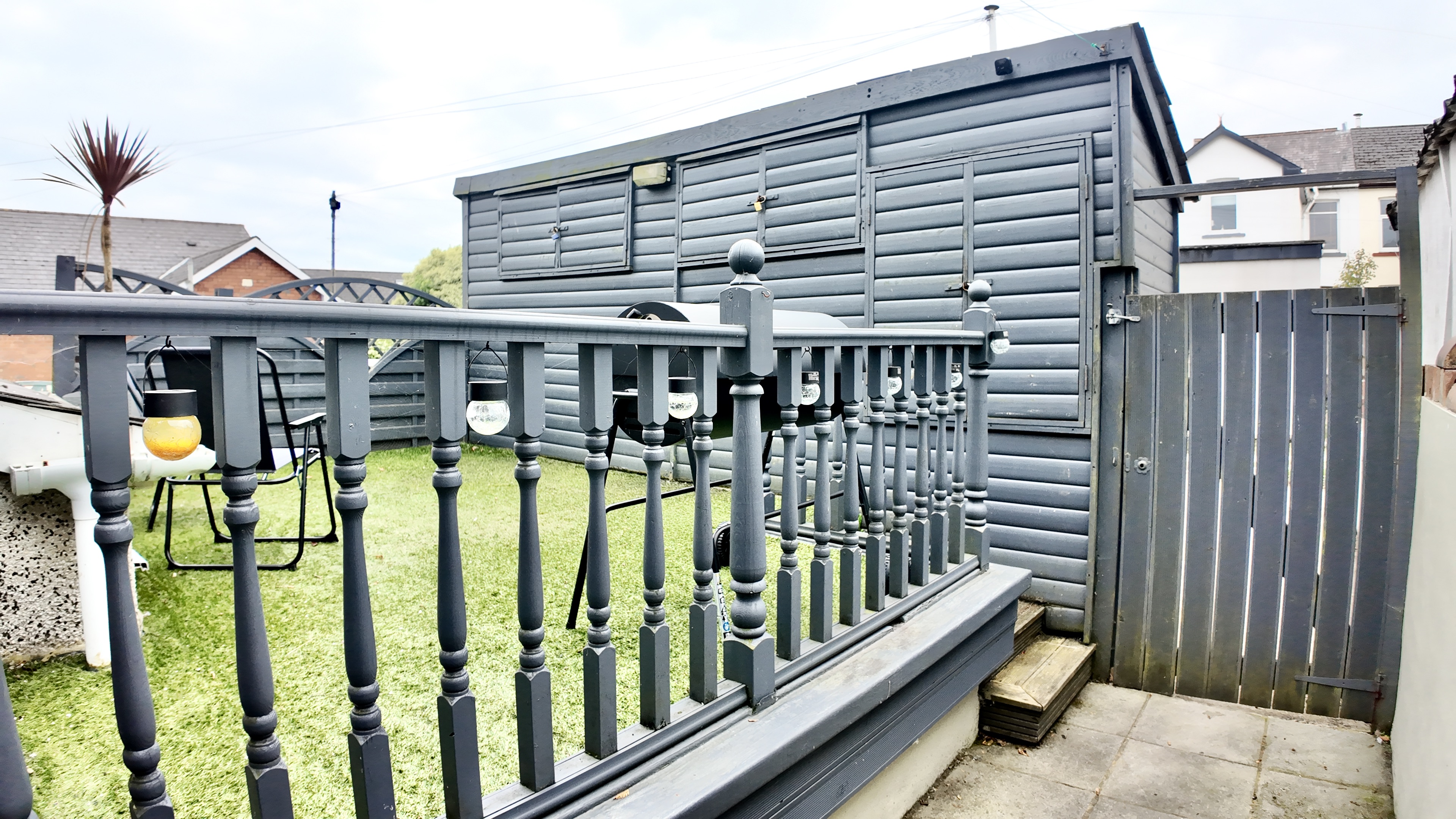 - Low maintenance rear garden with patio and decking seating area along with storage sheds