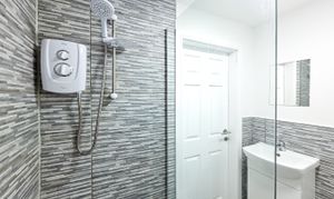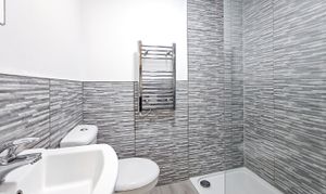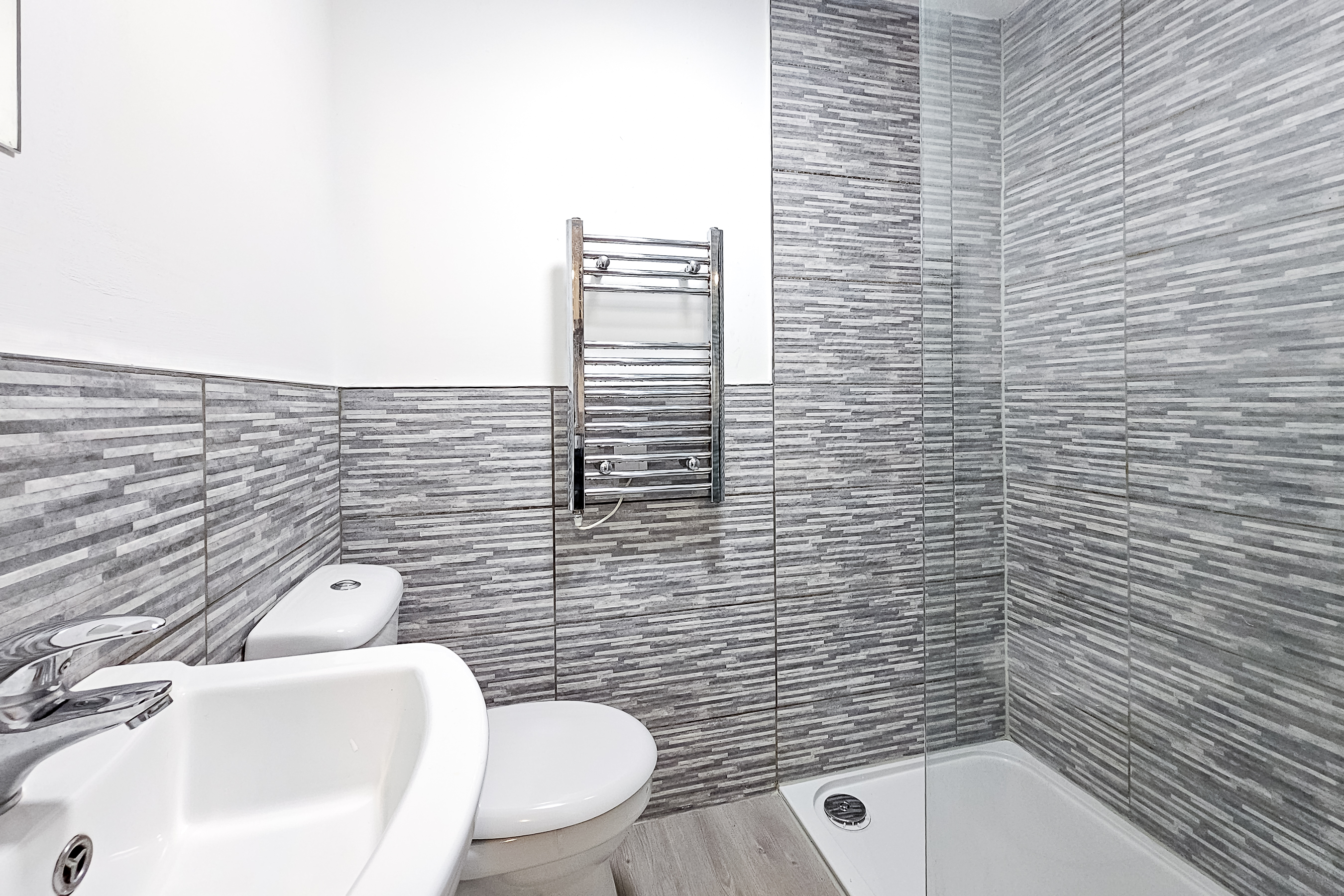 The bathroom features modern grey tiling, a walk-in shower, chrome fittings and a heated towel rail for added comfort. Throughout the home, the décor is clean and contemporary, giving the whole space a fresh and move-in-ready feel.