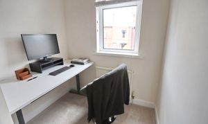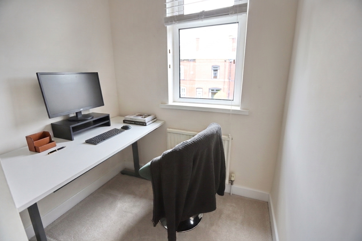 Upstairs, three well-appointed bedrooms provide flexible accommodation, with the main bedroom benefitting from stylish fitted furniture that maximises storage without compromising on aesthetics. The remaining bedrooms offer versatility for use as sleeping quarters, a home office, or nursery, catering to a variety of needs. The modern bathroom is finished to a high standard, featuring a contemporary suite with WC, bath, and shower facilities, ensuring convenience and comfort for all residents.