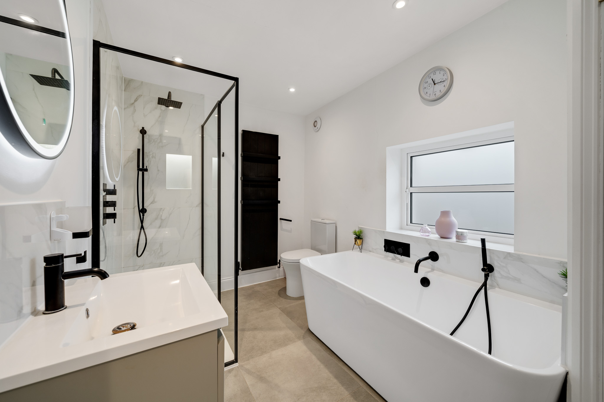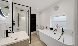 To the first floor, there are three well proportioned bedrooms – one with en-suite shower - plus a luxury family bathroom with contemporary free-standing bath suite and separate walk-in shower unit.