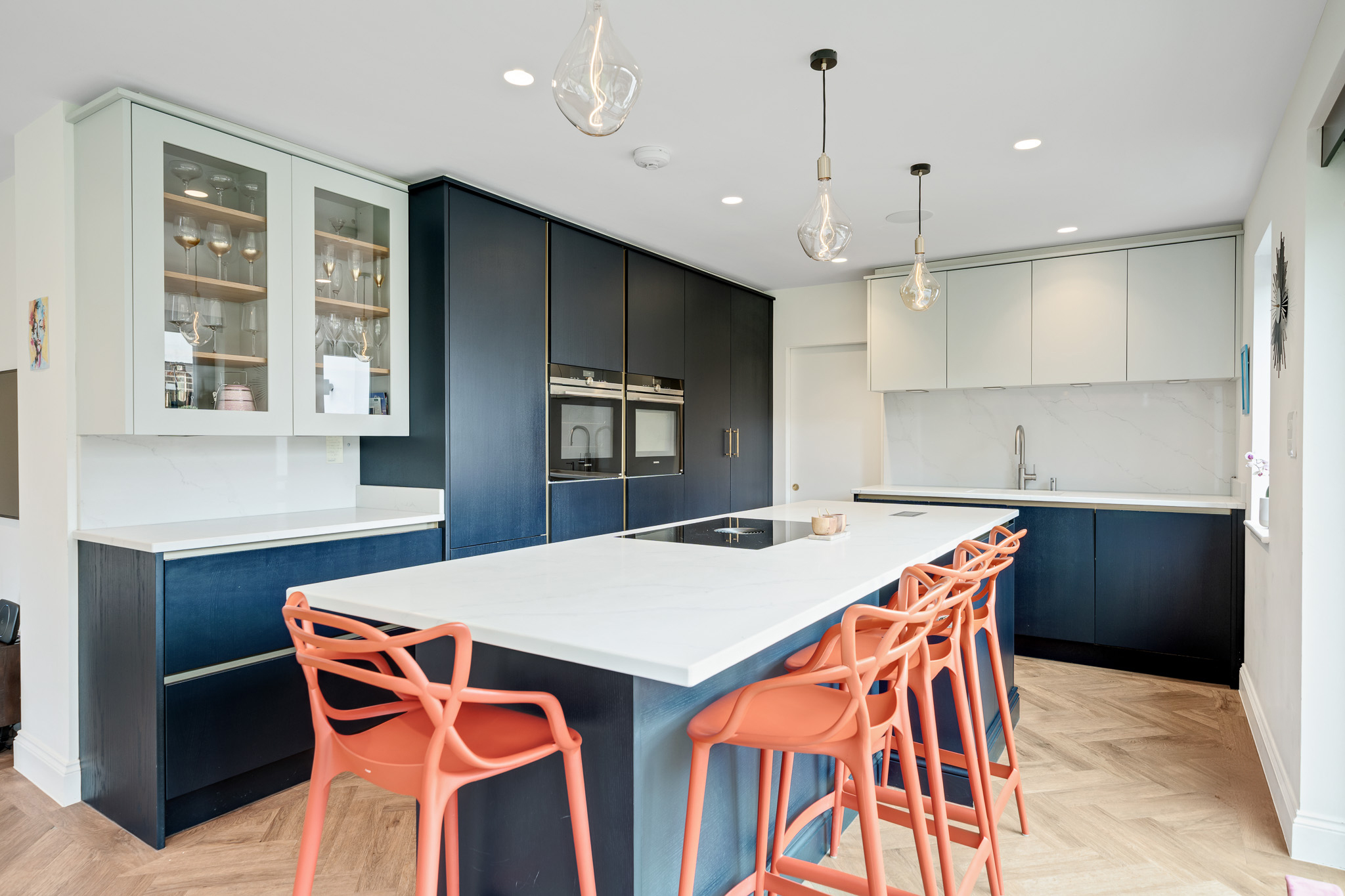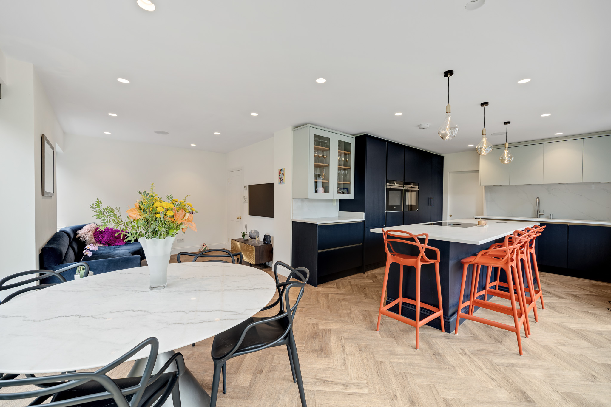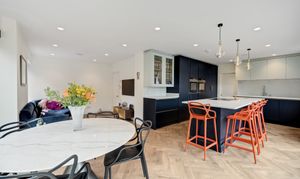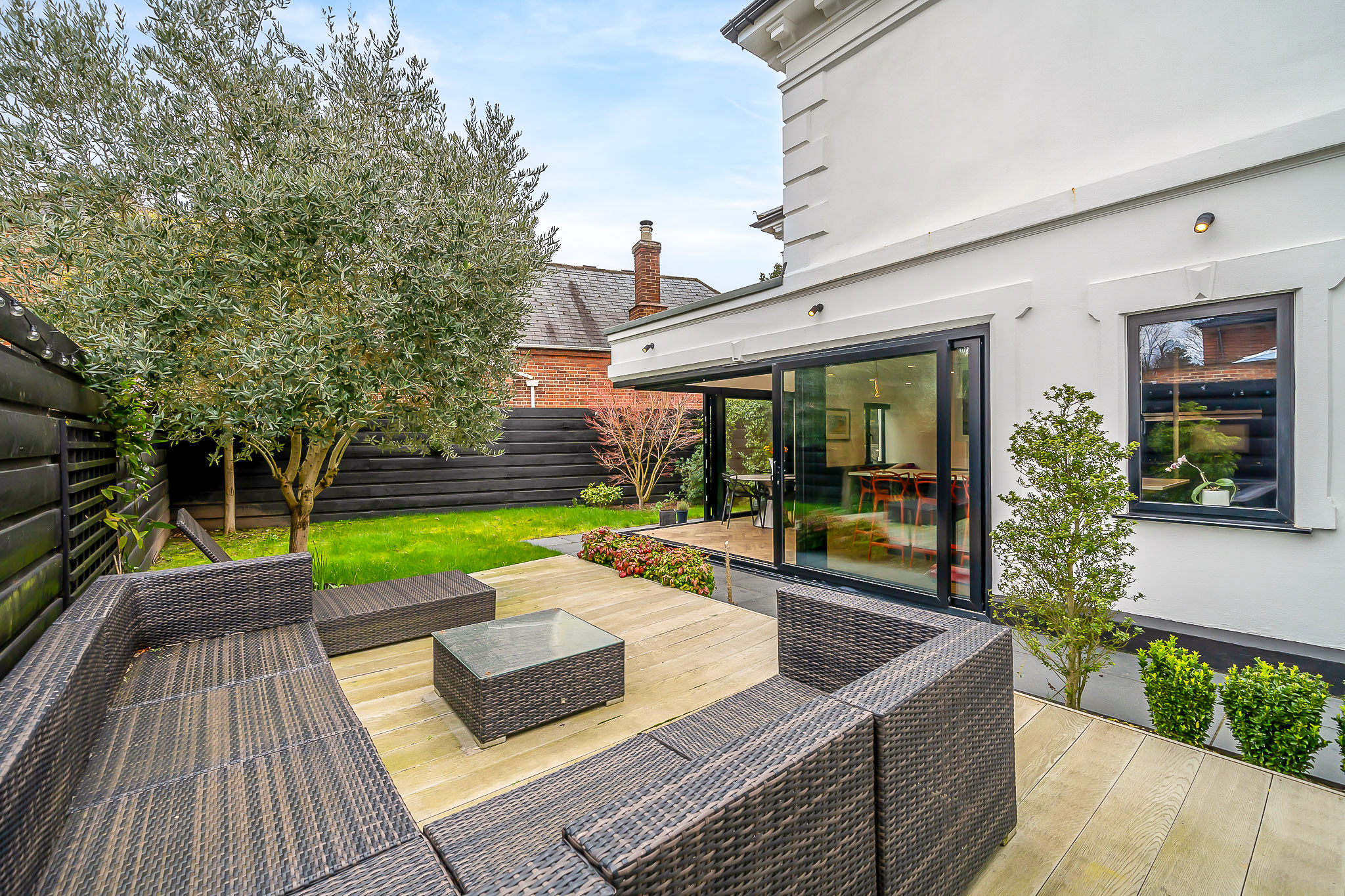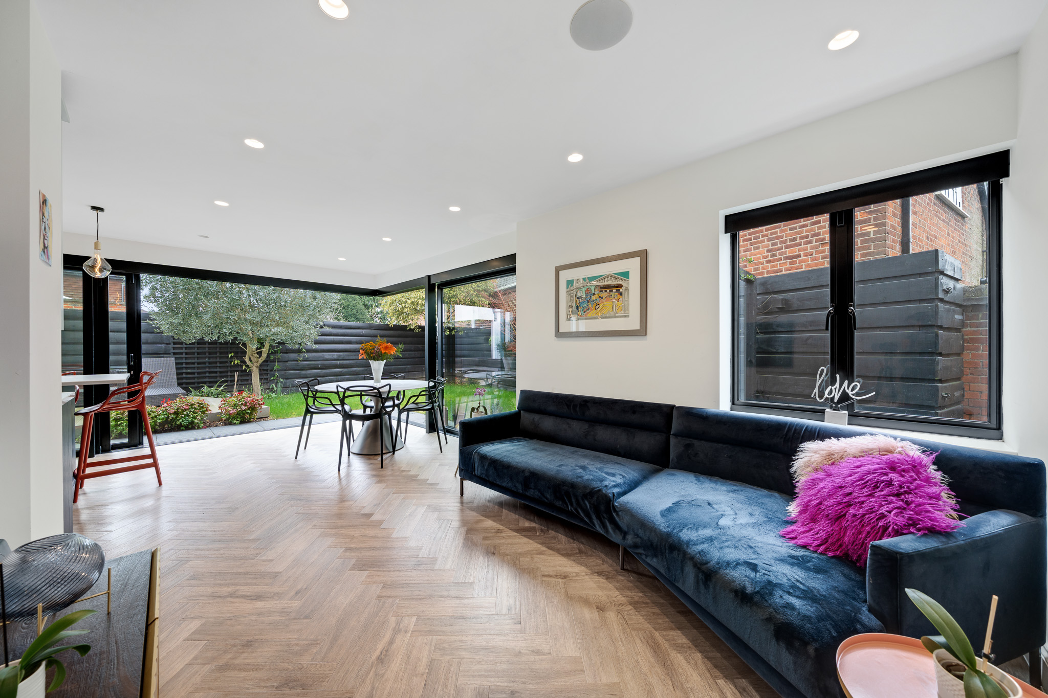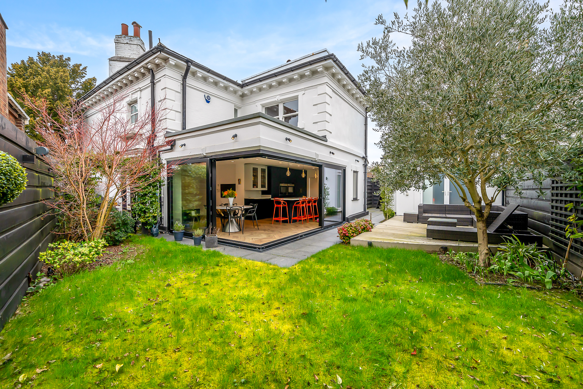Accommodation comprises entrance hall way with turning staircase, inbuilt storage and access to guest WC, leading into the two dual aspect reception rooms with ample space for relaxing, entertaining and dining. To the rear of the house, the wonderful L-shaped lounge/kitchen/diner is flooded with natural light from dual sets of sliding doors spilling out onto the garden – truly combining ‘ outside and inside’ and perfect for al fresco entertaining. The kitchen area comprises a high spec range of matching wall and base units with work surfaces, incorporating inset sink unit, induction hob, double wall mounted oven, and further integrated appliances. A separate utility provides work and storage space.