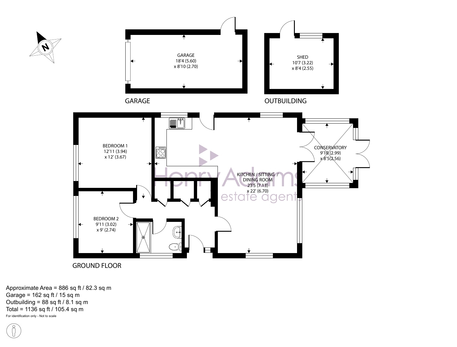 Set in a peaceful residential area, this well-presented two-bedroom detached bungalow offers a superb opportunity to enjoy single-level living with a blend of comfort, practicality, and character. With a total footprint of approximately 1,136 sq ft (105.4 sq m) including the garage, the home is thoughtfully designed to accommodate a relaxed and versatile lifestyle.