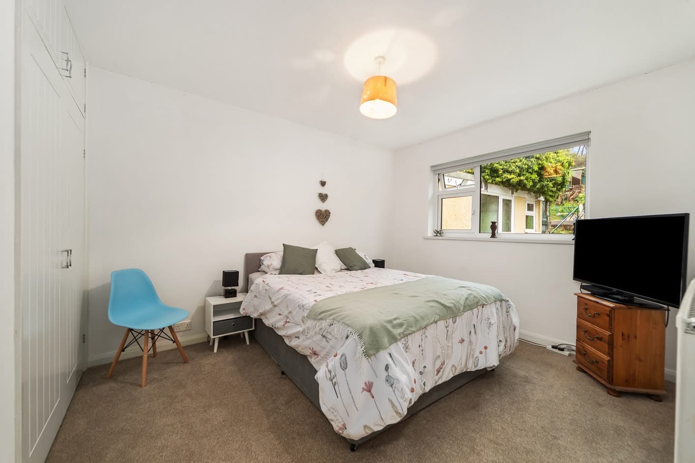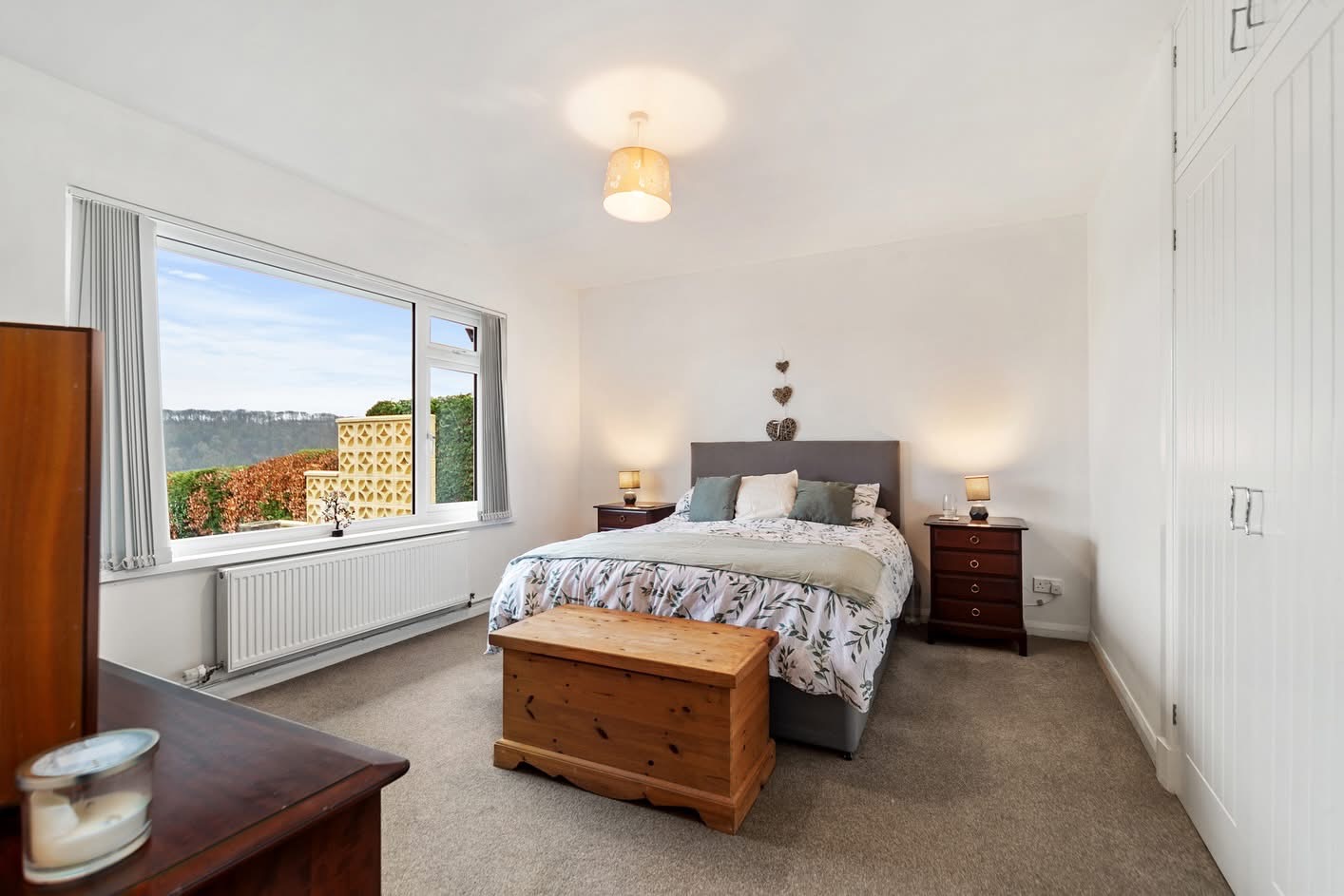 Main bedroom with large picture window to the fore, radiator and ceiling light point.